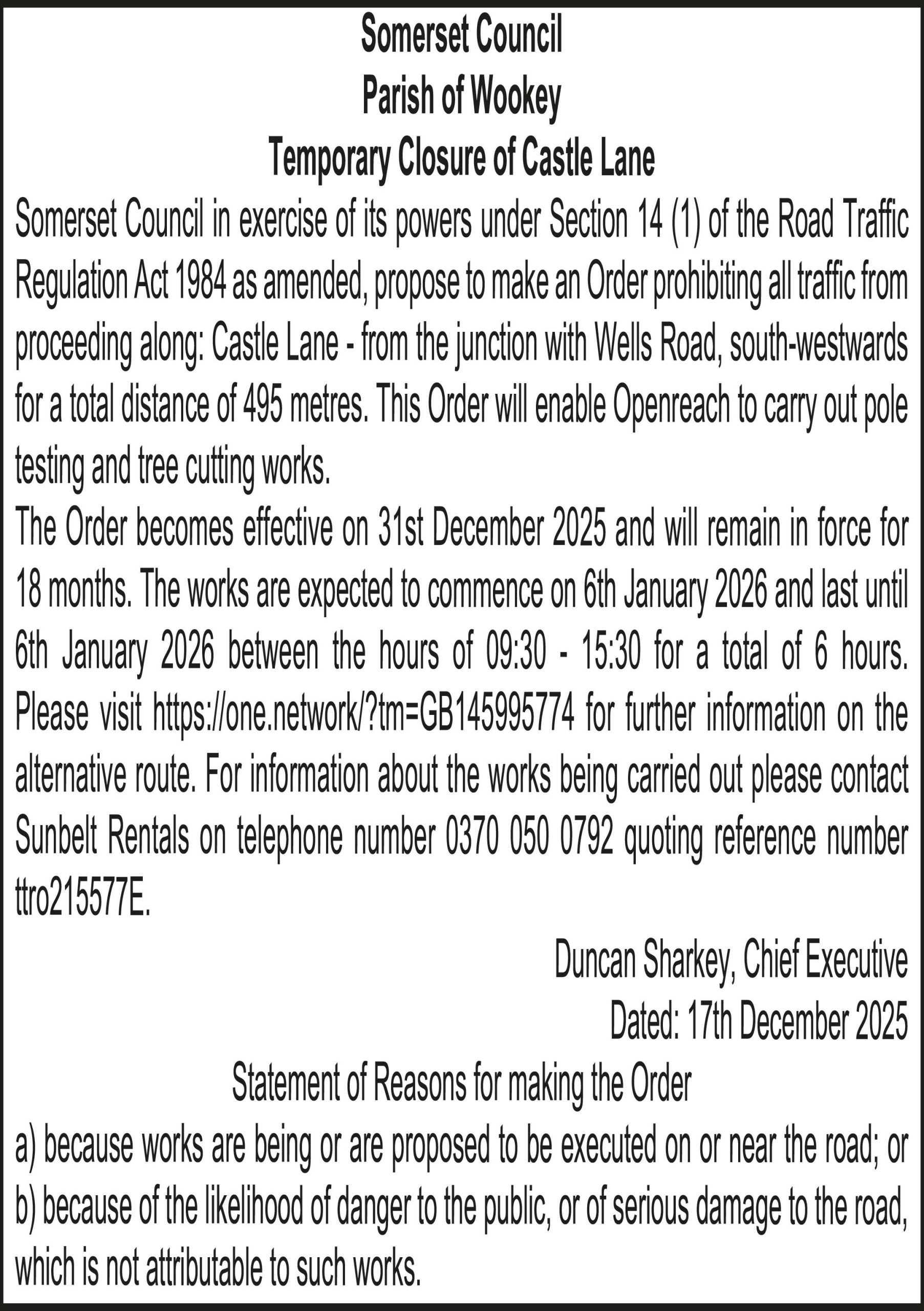Somerset Council in exercise of its powers under Section 14 (1) of the Road Traffic Regulation Act 1984 as amended, propose to make an Order prohibiting all traffic from proceeding along: Castle Lane – from the junction with Wells Road, south-westwards for a total distance of 495 metres. This Order will enable Openreach to carry out pole testing and tree cutting works.