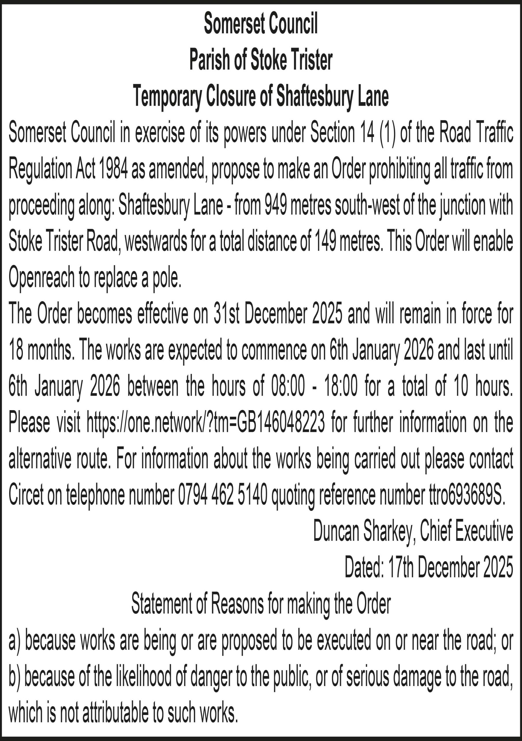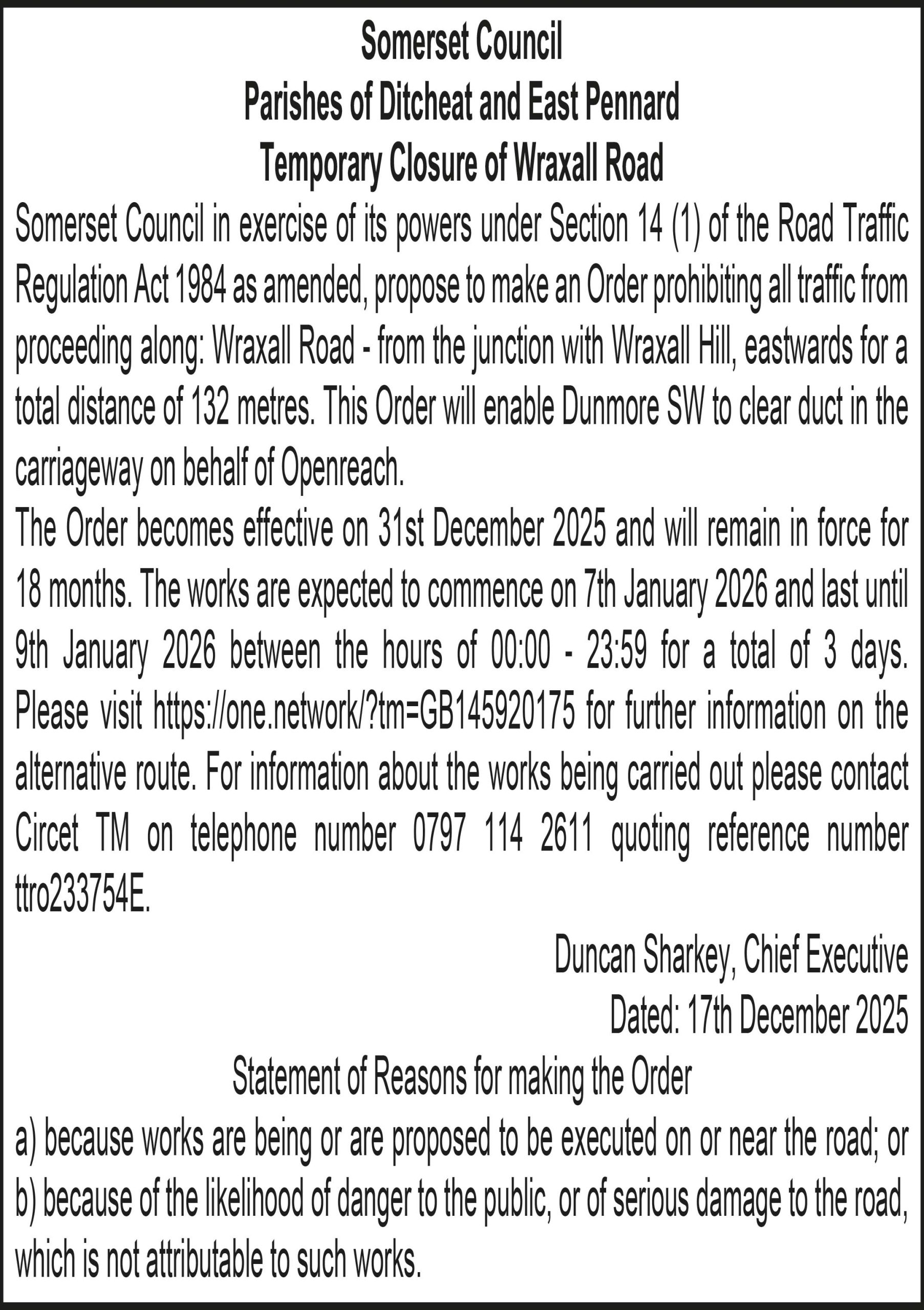 The Order becomes effective on 31st December 2025 and will remain in force for 18 months. The works are expected to commence on 7th January 2026 and last until 9th January 2026 between the hours of 00:00 – 23:59 for a total of 3 days. Please visit https://one.network/?tm=GB145920175 for further information on the alternative route. For information about the works being carried out please contact Circet TM on telephone number 0797 114 2611 quoting reference number