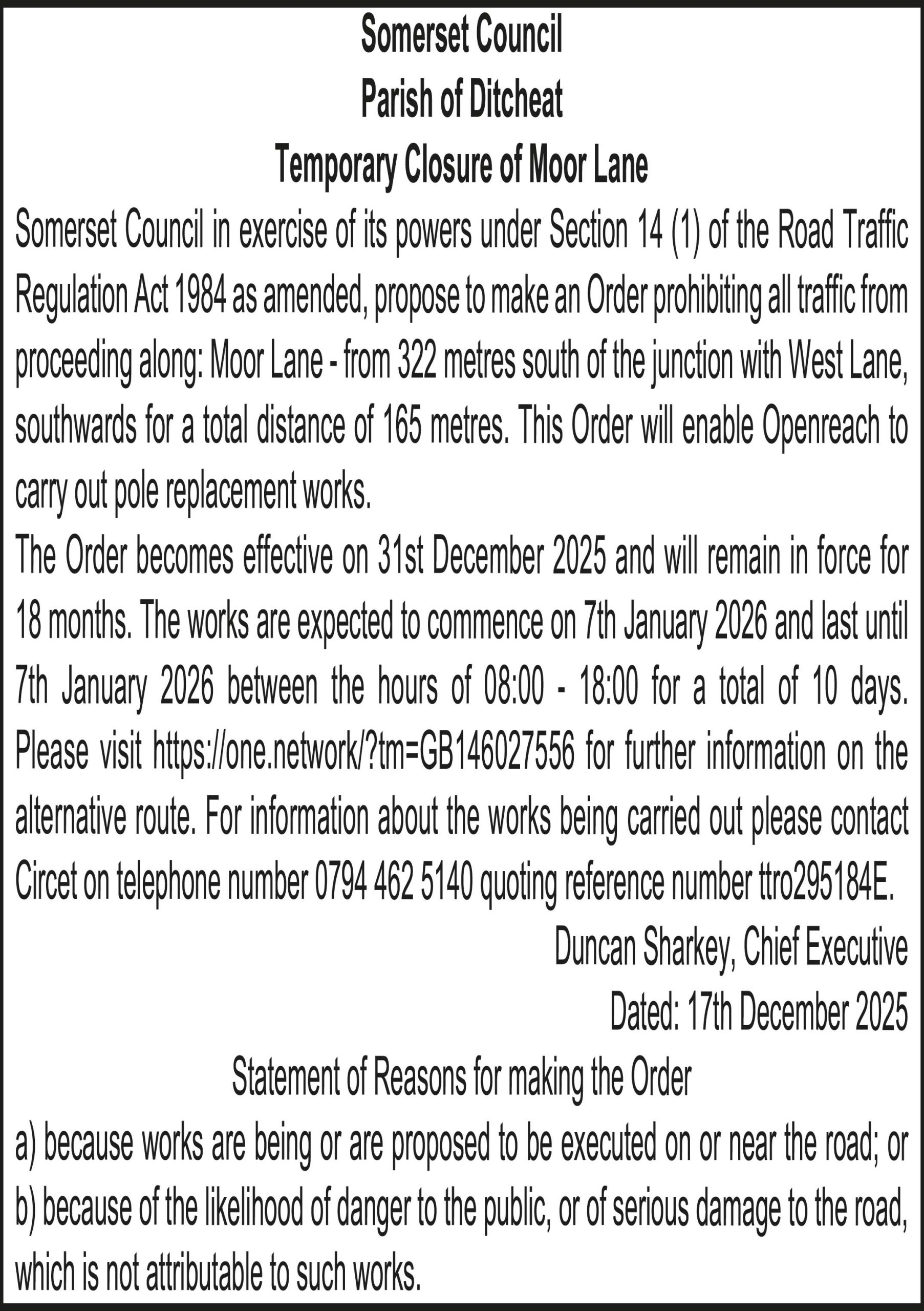 Somerset Council in exercise of its powers under Section 14 (1) of the Road Traffic Regulation Act 1984 as amended, propose to make an Order prohibiting all traffic from proceeding along: Moor Lane – from 322 metres south of the junction with West Lane, southwards for a total distance of 165 metres. This Order will enable Openreach to carry out pole replacement works.