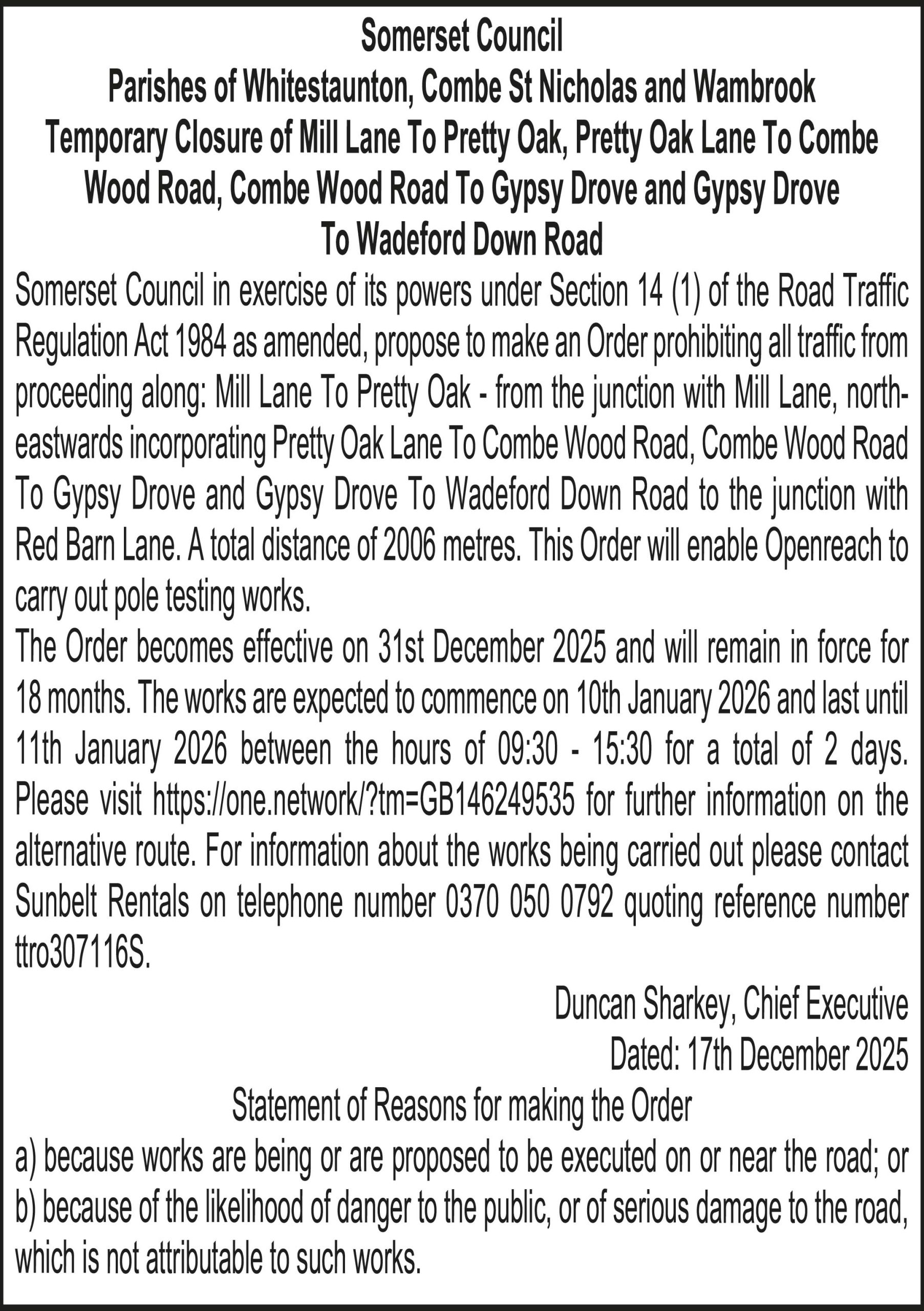 Somerset Council in exercise of its powers under Section 14 (1) of the Road Traffic Regulation Act 1984 as amended, propose to make an Order prohibiting all traffic from proceeding along: Mill Lane To Pretty Oak – from the junction with Mill Lane, northeastwards incorporating Pretty Oak Lane To Combe Wood Road, Combe Wood Road To Gypsy Drove and Gypsy Drove To Wadeford Down Road to the junction with Red Barn Lane. A total distance of 2006 metres. This Order will enable Openreach to carry out pole testing works.