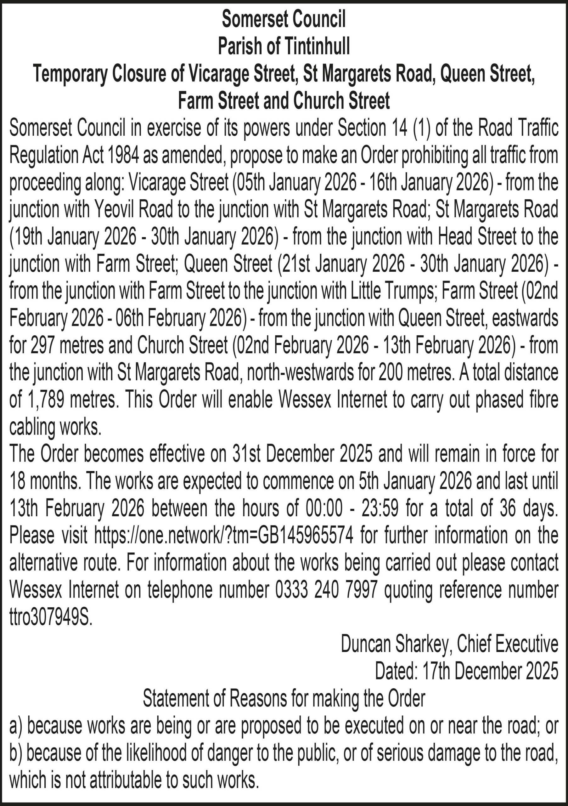 Somerset Council in exercise of its powers under Section 14 (1) of the Road Traffic Regulation Act 1984 as amended, propose to make an Order prohibiting all traffic from proceeding along: Vicarage Street (05th January 2026 – 16th January 2026) – from the junction with Yeovil Road to the junction with St Margarets Road; St Margarets Road (19th January 2026 – 30th January 2026) – from the junction with Head Street to the junction with Farm Street; Queen Street (21st January 2026 – 30th January 2026) – from the junction with Farm Street to the junction with Little Trumps; Farm Street (02nd February 2026 – 06th February 2026) – from the junction with Queen Street, eastwards for 297 metres and Church Street (02nd February 2026 – 13th February 2026) – from the junction with St Margarets Road, north-westwards for 200 metres. A total distance of 1,789 metres. This Order will enable Wessex Internet to carry out phased fibre cabling works.