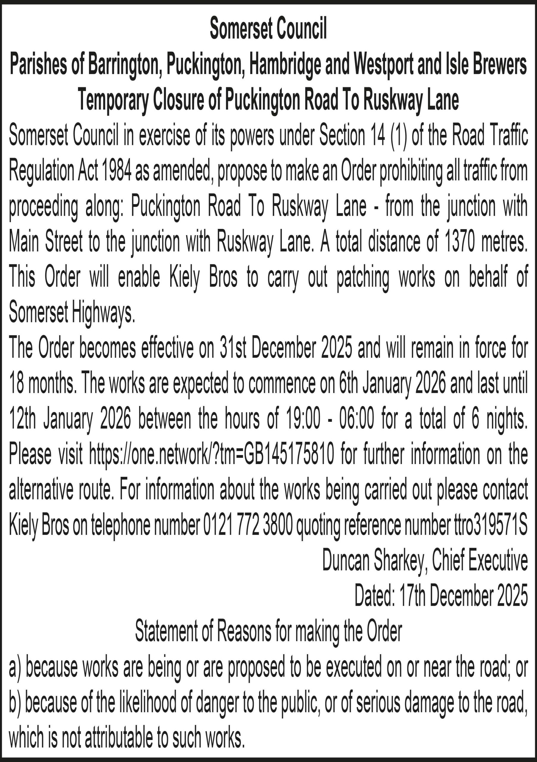 Somerset Council in exercise of its powers under Section 14 (1) of the Road Traffic Regulation Act 1984 as amended, propose to make an Order prohibiting all traffic from proceeding along: Puckington Road To Ruskway Lane – from the junction with Main Street to the junction with Ruskway Lane. A total distance of 1370 metres. This Order will enable Kiely Bros to carry out patching works on behalf of Somerset Highways.
