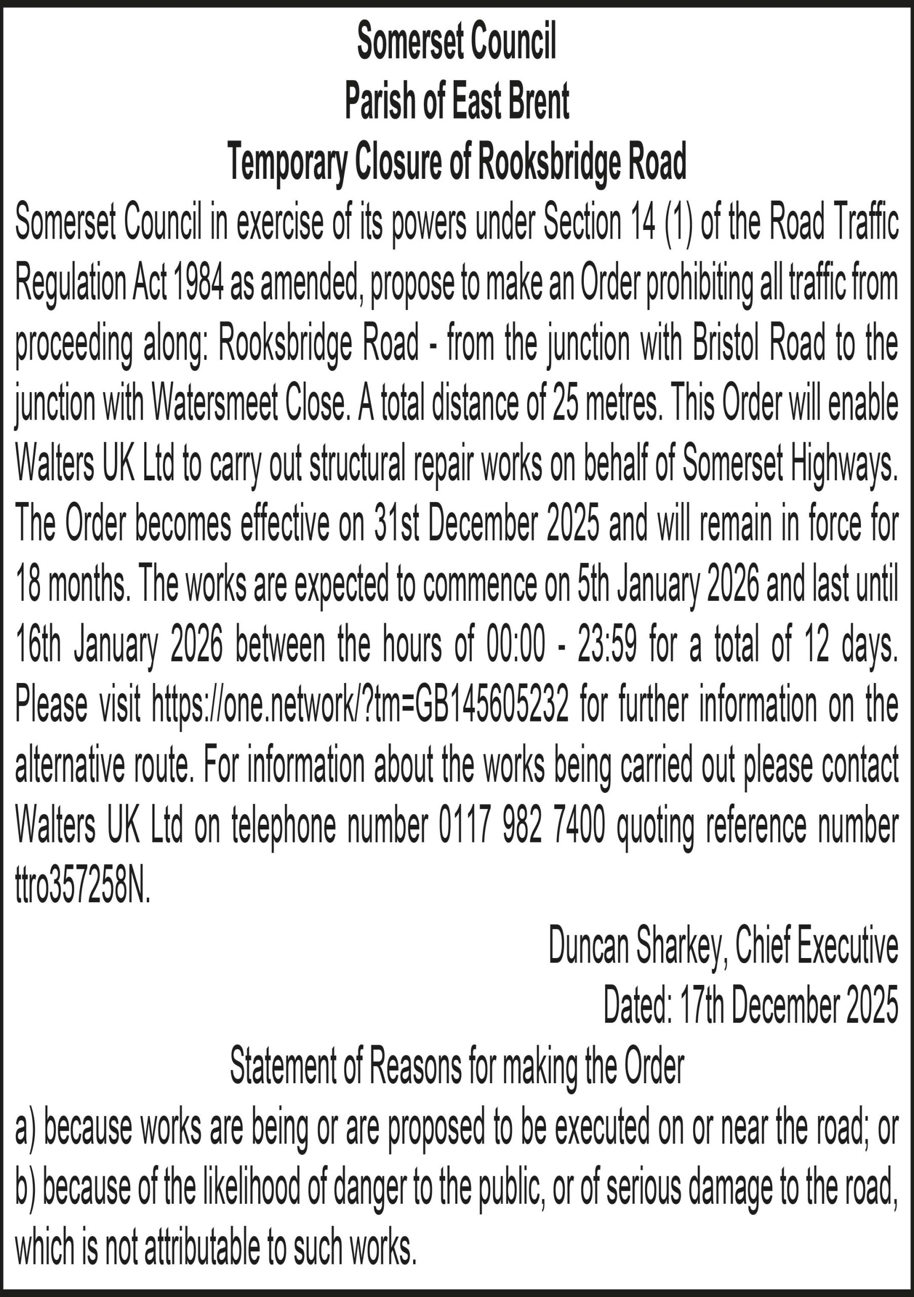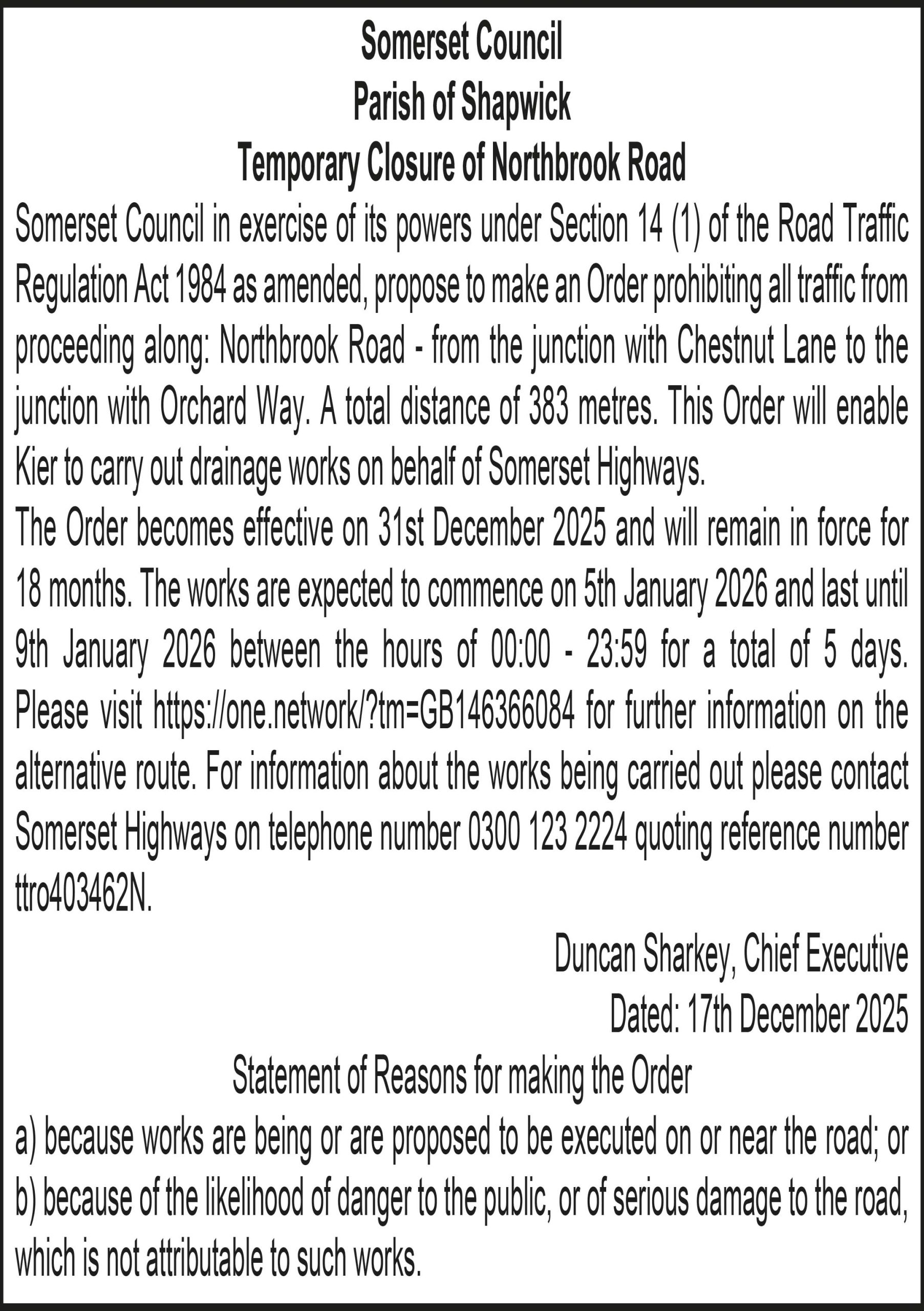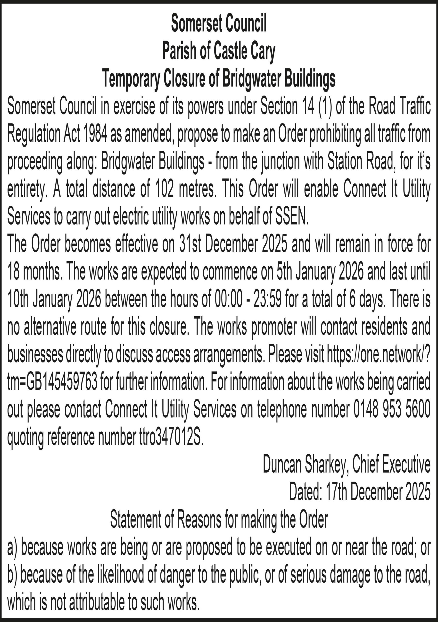 The Order becomes effective on 31st December 2025 and will remain in force for 18 months. The works are expected to commence on 5th January 2026 and last until 9th January 2026 between the hours of 00:00 – 23:59 for a total of 5 days.