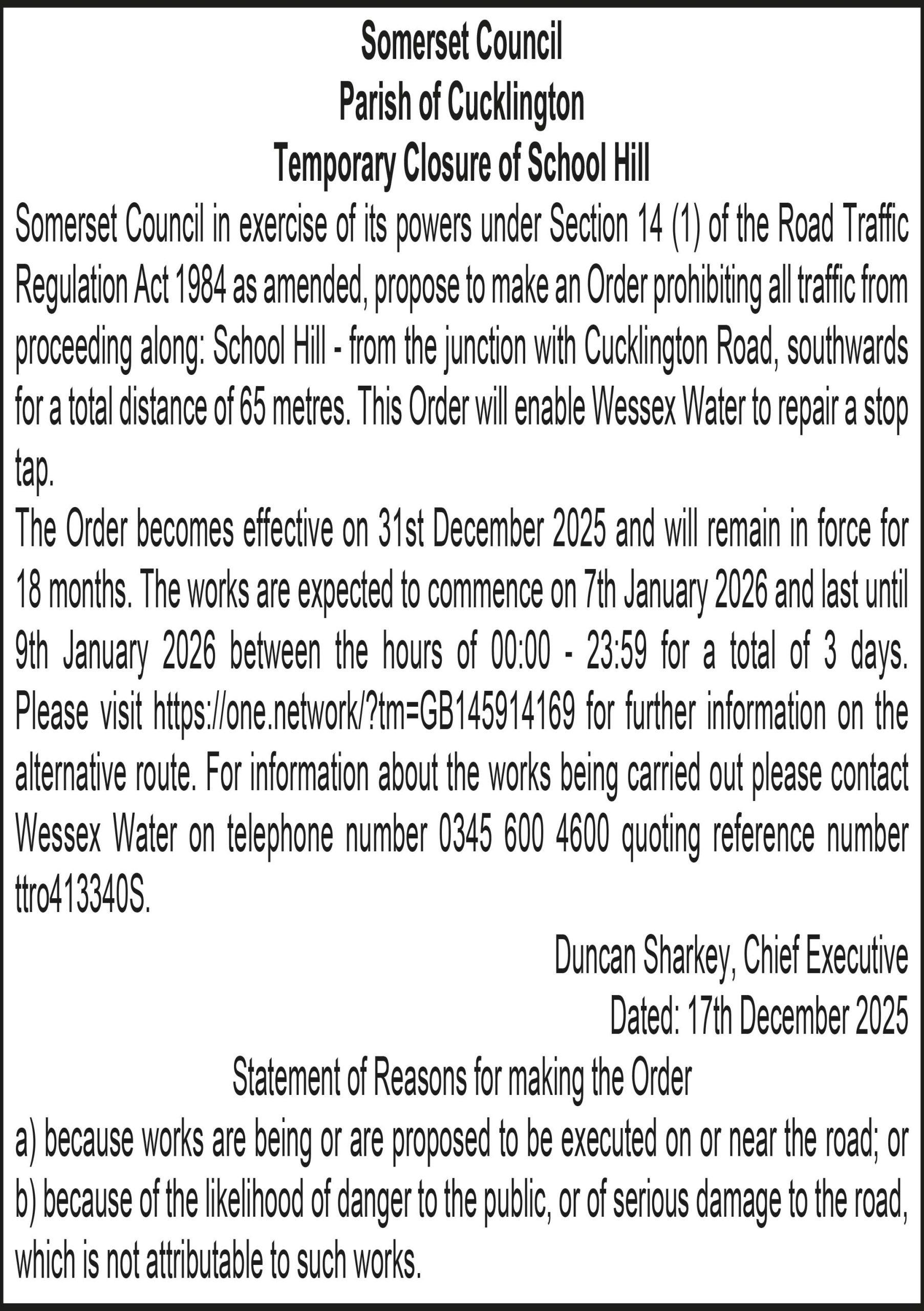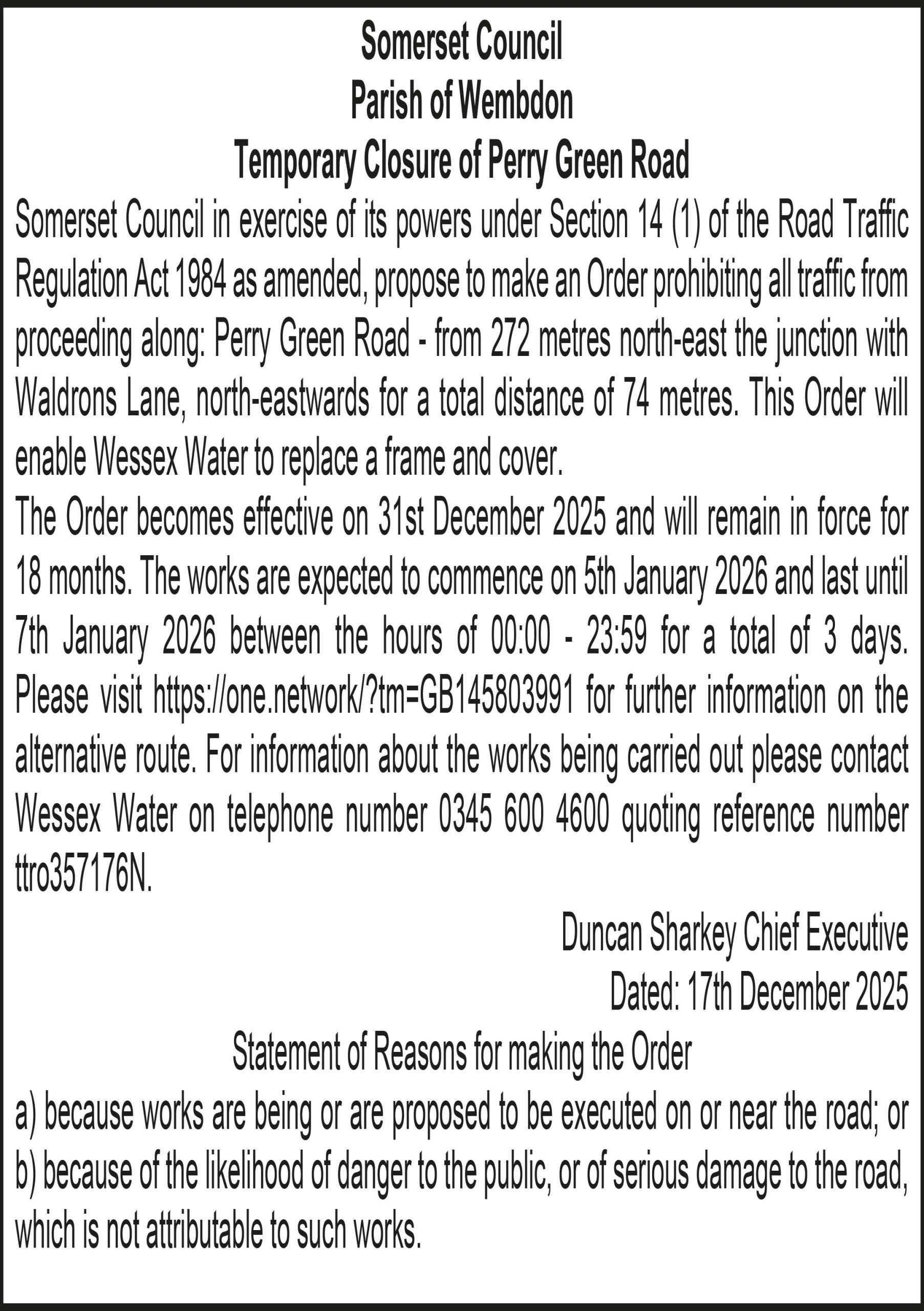 The Order becomes effective on 31st December 2025 and will remain in force for 18 months. The works are expected to commence on 5th January 2026 and last until 7th January 2026 between the hours of 00:00 – 23:59 for a total of 3 days. Please visit https://one.network/?tm=GB146684961 for further information on the alternative route. For information about the works being carried out please contact Wessex Water on telephone number 0345 600 4600 quoting reference number ttro213995S.