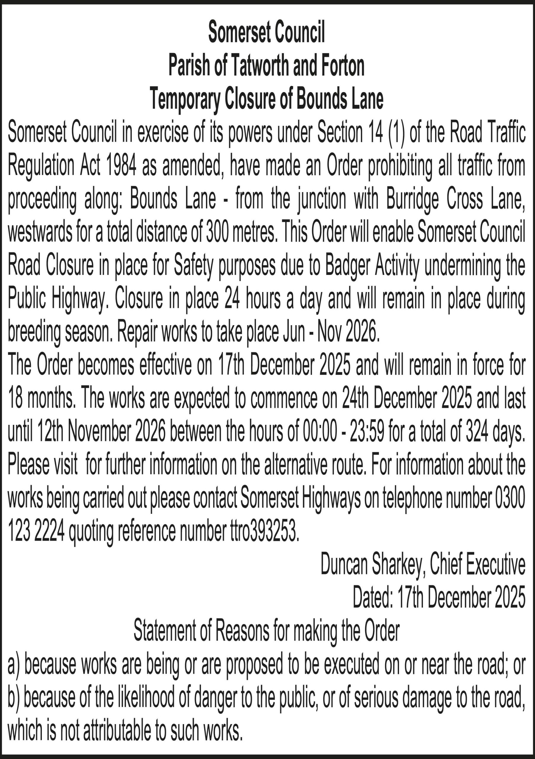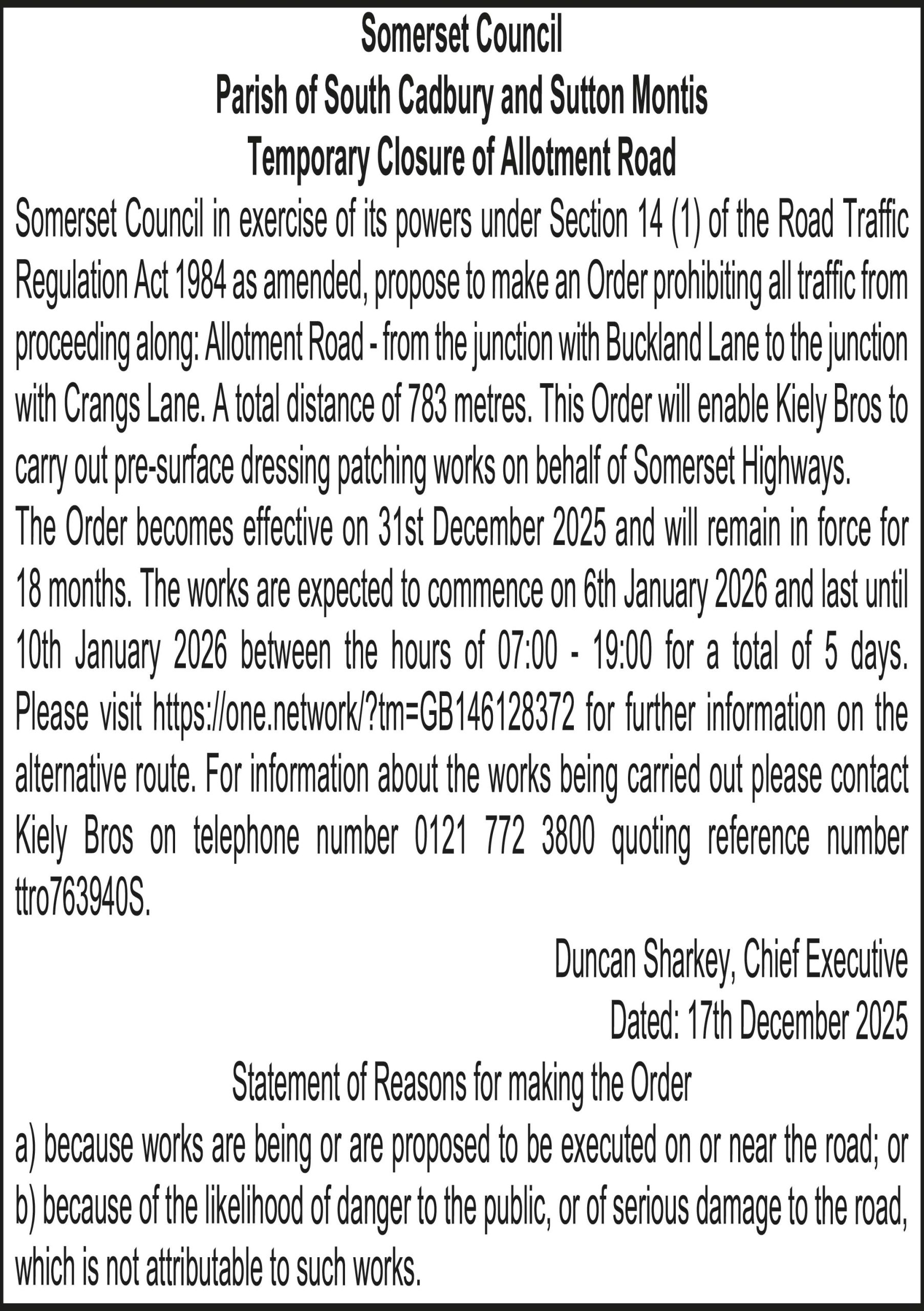 Somerset Council in exercise of its powers under Section 14 (1) of the Road Traffic Regulation Act 1984 as amended, propose to make an Order prohibiting all traffic from proceeding along: Allotment Road – from the junction with Buckland Lane to the junction with Crangs Lane. A total distance of 783 metres. This Order will enable Kiely Bros to carry out pre-surface dressing patching works on behalf of Somerset Highways.