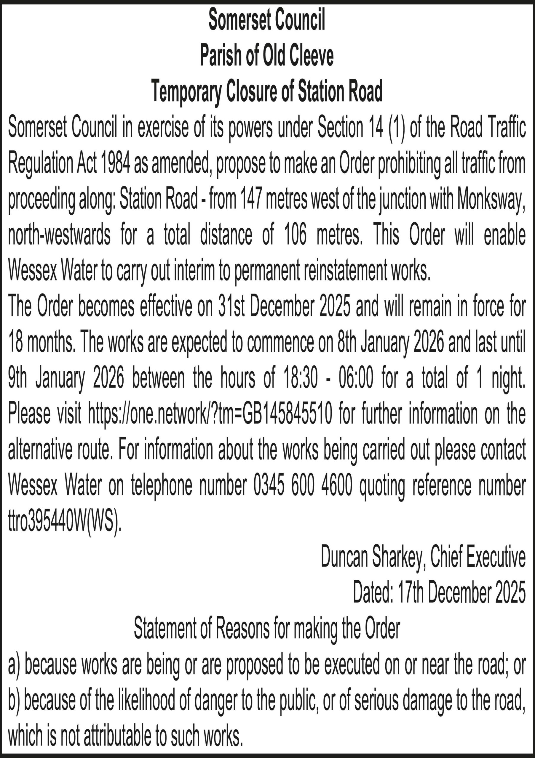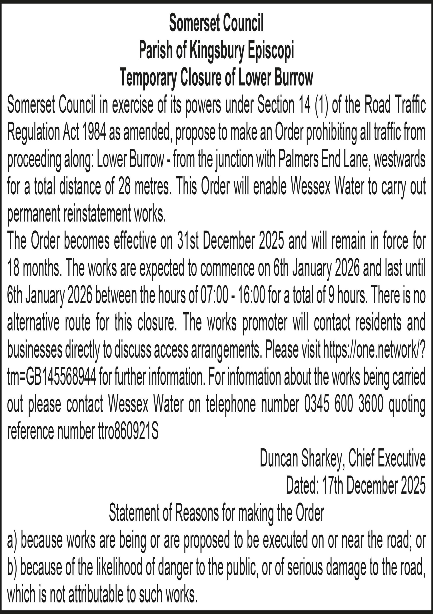 The Order becomes effective on 31st December 2025 and will remain in force for 18 months. The works are expected to commence on 6th January 2026 and last until 6th January 2026 between the hours of 07:00 – 16:00 for a total of 9 hours. There is no alternative route for this closure. The works promoter will contact residents and businesses directly to discuss access arrangements. Please visit https://one.network/?tm=GB145568944 for further information. For information about the works being carried out please contact Wessex Water on telephone number 0345 600 3600 quoting reference number ttro860921S