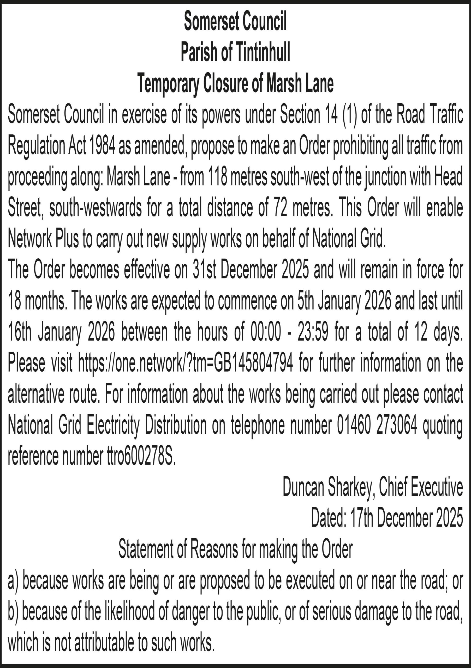 The Order becomes effective on 17th December 2025 and will remain in force for 18 months. The works are expected to commence on 22nd December 2025 and last until 24th December 2025 between the hours of 08:00 – 16:30 for a total of 3 days. There is no alternative route for this closure. The works promoter will contact residents and businesses directly to discuss access arrangements. Please visit https://one.network/?tm=GB146567730 for further information. For information about the works being carried out please contact National Grid on telephone number 01823 348575 quoting reference number ttro823544W(TD).
