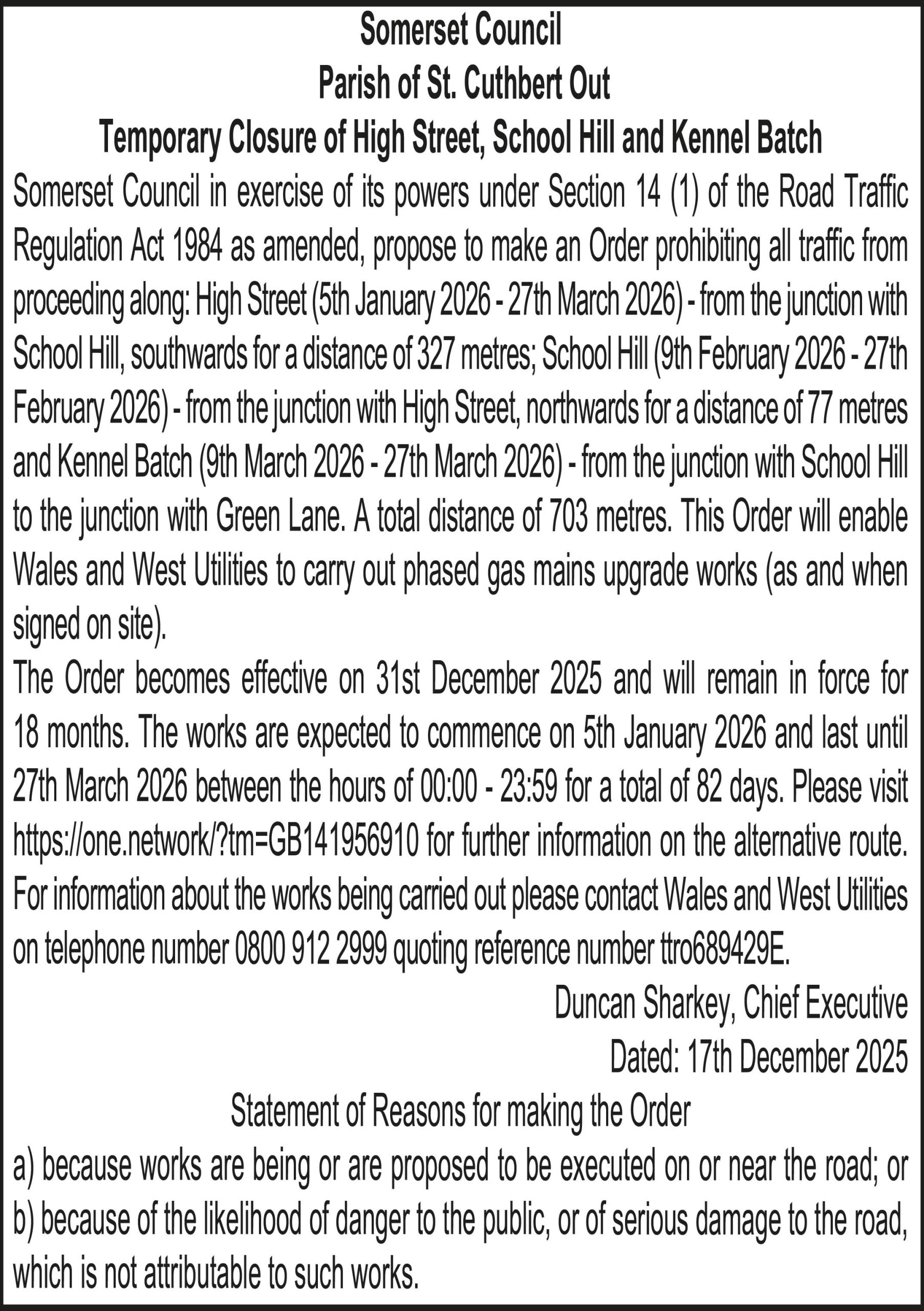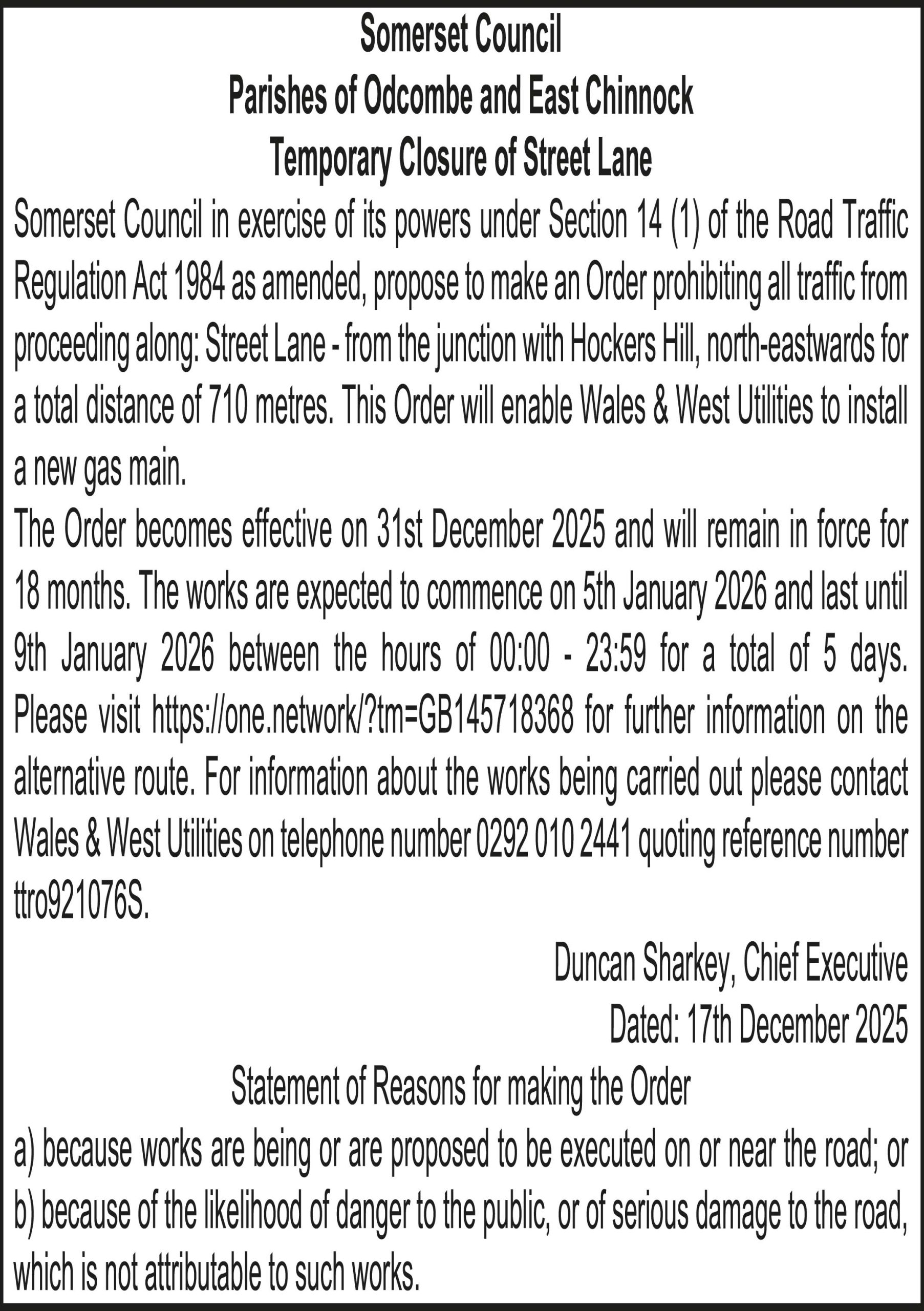 Somerset Council in exercise of its powers under Section 14 (1) of the Road Traffic Regulation Act 1984 as amended, propose to make an Order prohibiting all traffic from proceeding along: Street Lane – from the junction with Hockers Hill, north-eastwards for a total distance of 710 metres. This Order will enable Wales & West Utilities to install a new gas main.
