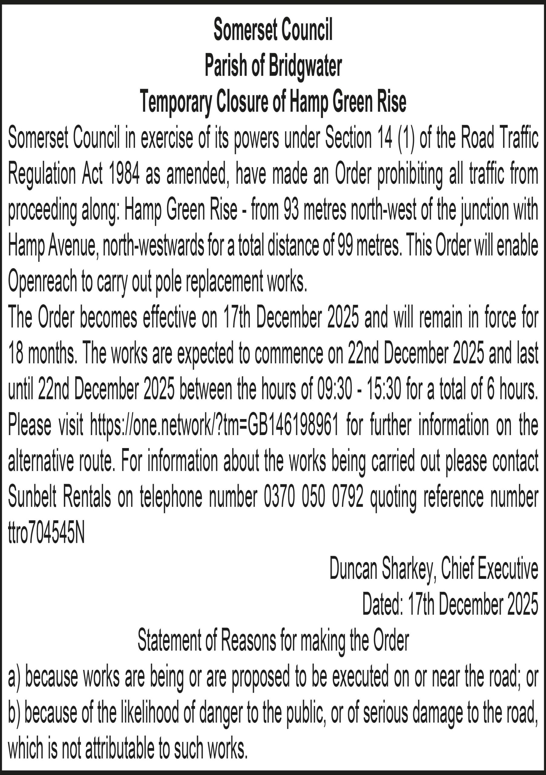 The Order becomes effective on 31st December 2025 and will remain in force for 18 months. The works are expected to commence on 8th January 2026 and last until 8th January 2026 between the hours of 09:30 – 15:30 for a total of 6 hours. Please visit https://one.network/?tm=GB146102112 for further information on the alternative route. For information about the works being carried out please contact Sunbelt Rentals on telephone number 0370 050 0792 quoting reference number ttro012970N.