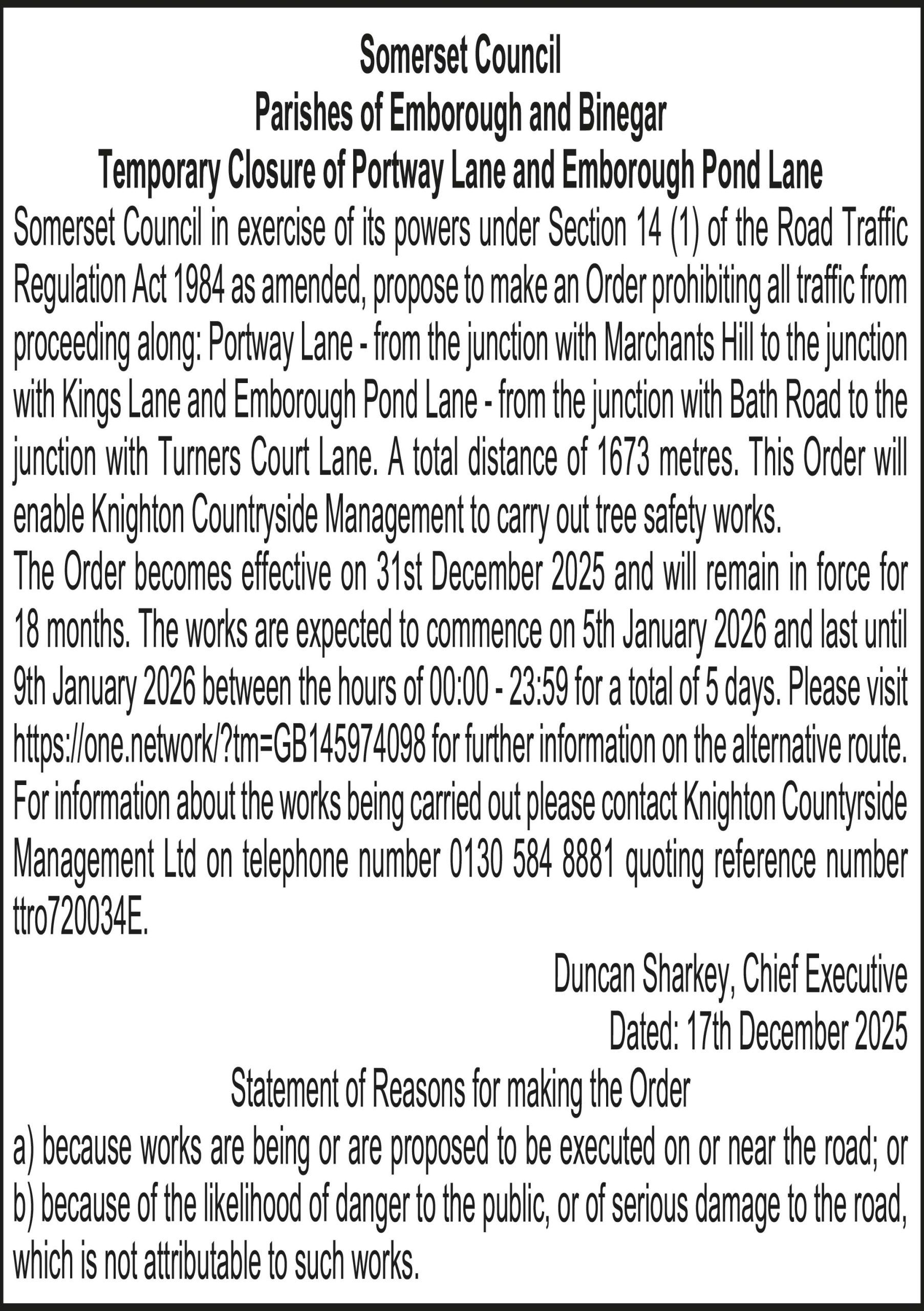 Somerset Council in exercise of its powers under Section 14 (1) of the Road Traffic Regulation Act 1984 as amended, propose to make an Order prohibiting all traffic from proceeding along: Portway Lane – from the junction with Marchants Hill to the junction with Kings Lane and Emborough Pond Lane – from the junction with Bath Road to the junction with Turners Court Lane. A total distance of 1673 metres. This Order will enable Knighton Countryside Management to carry out tree safety works.