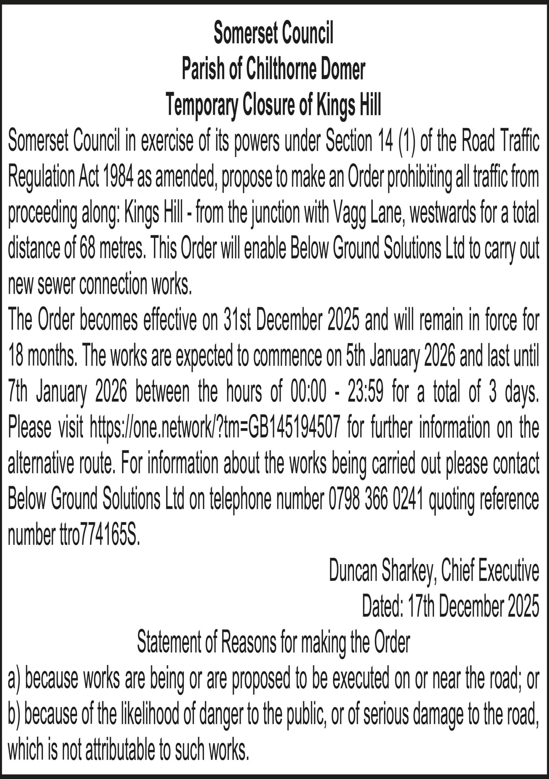 Somerset Council in exercise of its powers under Section 14 (1) of the Road Traffic Regulation Act 1984 as amended, propose to make an Order prohibiting all traffic from proceeding along: Kings Hill – from the junction with Vagg Lane, westwards for a total distance of 68 metres. This Order will enable Below Ground Solutions Ltd to carry out new sewer connection works.