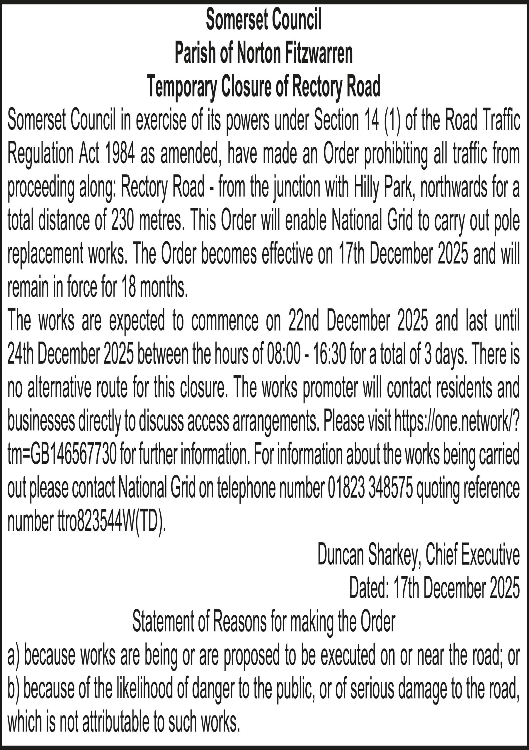 Somerset Council in exercise of its powers under Section 14 (1) of the Road Traffic Regulation Act 1984 as amended, have made an Order prohibiting all traffic from proceeding along: Rectory Road – from the junction with Hilly Park, northwards for a total distance of 230 metres. This Order will enable National Grid to carry out pole replacement works.