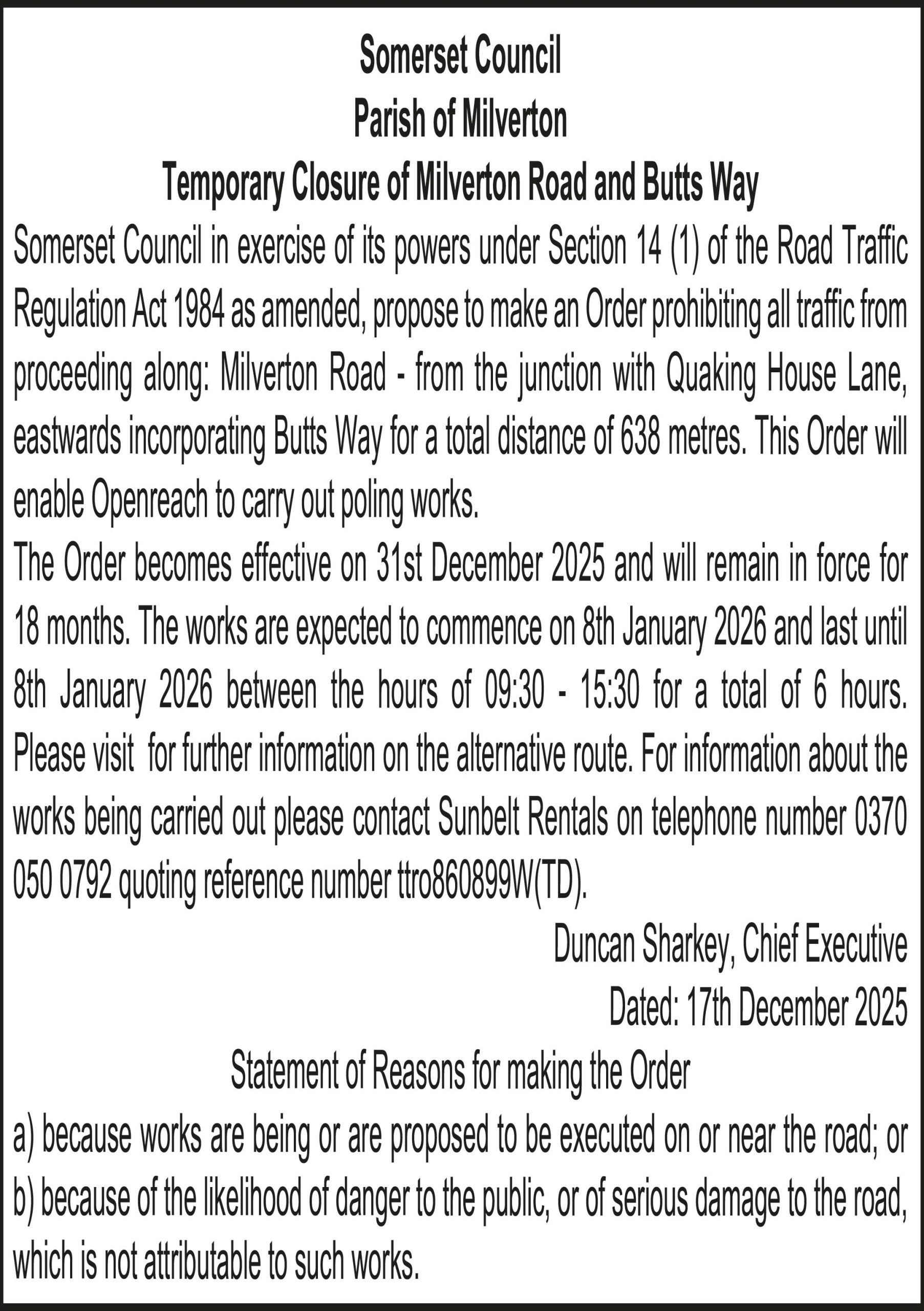 Somerset Council in exercise of its powers under Section 14 (1) of the Road Traffic Regulation Act 1984 as amended, propose to make an Order prohibiting all traffic from proceeding along: Milverton Road – from the junction with Quaking House Lane, eastwards incorporating Butts Way for a total distance of 638 metres. This Order will enable Openreach to carry out poling works.
