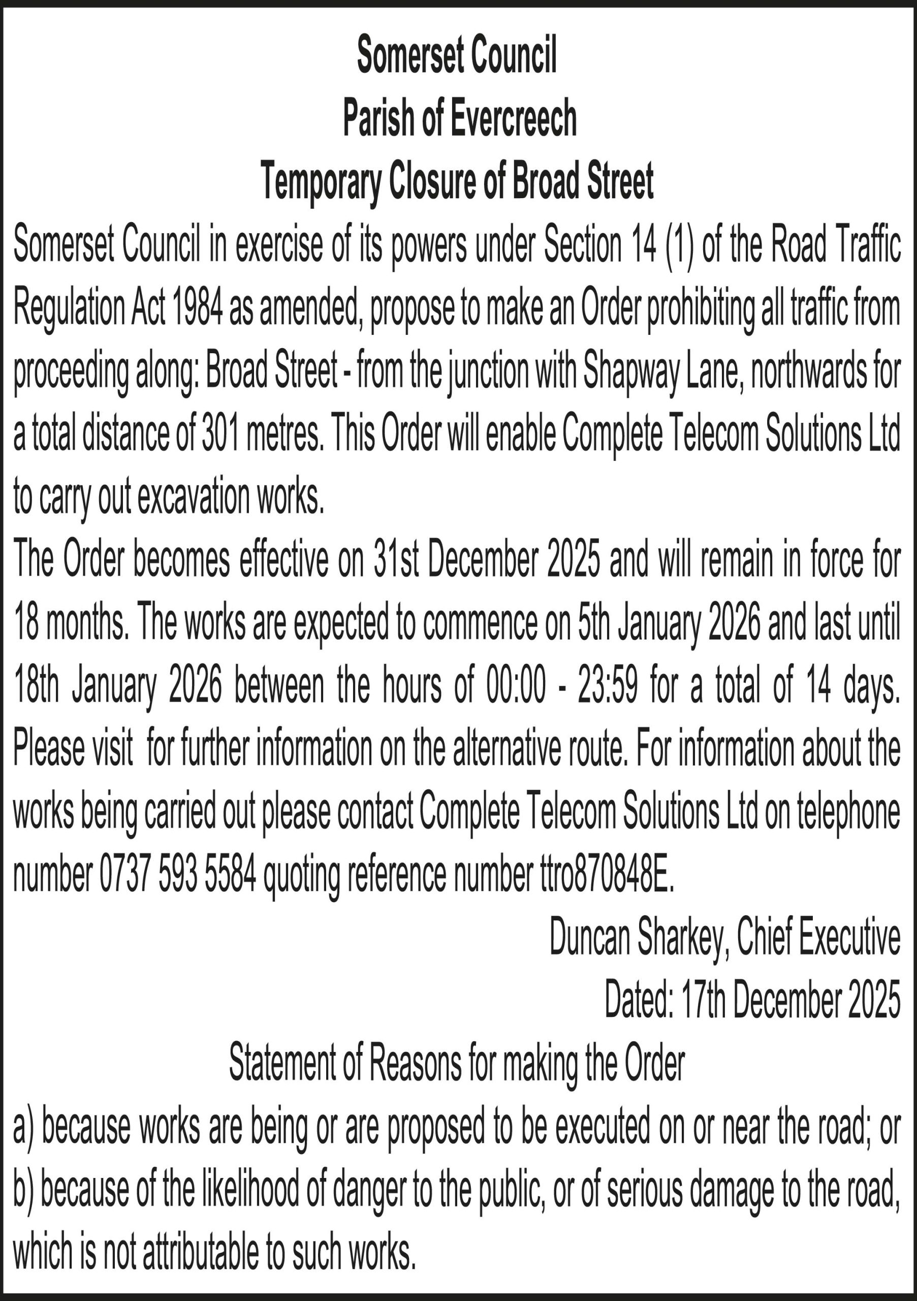 Somerset Council in exercise of its powers under Section 14 (1) of the Road Traffic Regulation Act 1984 as amended, propose to make an Order prohibiting all traffic from proceeding along: Broad Street – from the junction with Shapway Lane, northwards for a total distance of 301 metres. This Order will enable Complete Telecom Solutions Ltd to carry out excavation works.