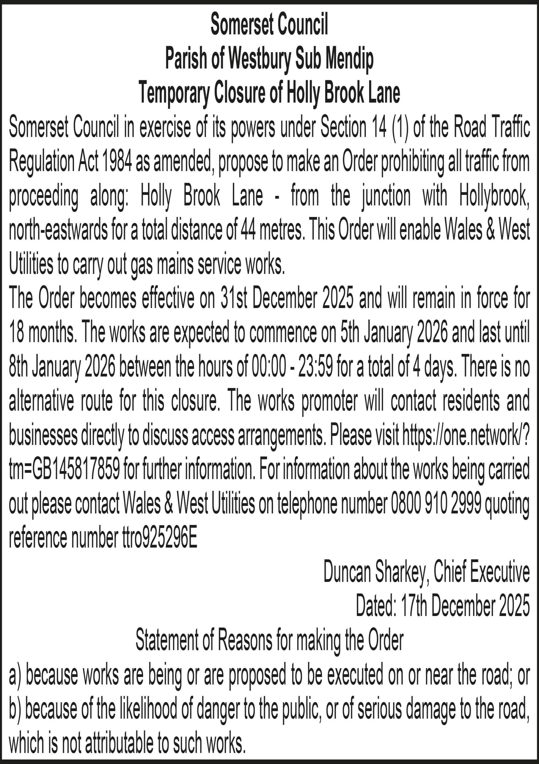 Somerset Council in exercise of its powers under Section 14 (1) of the Road Traffic Regulation Act 1984 as amended, propose to make an Order prohibiting all traffic from proceeding along: Holly Brook Lane – from the junction with Hollybrook, north-eastwards for a total distance of 44 metres. This Order will enable Wales & West Utilities to carry out gas mains service works.