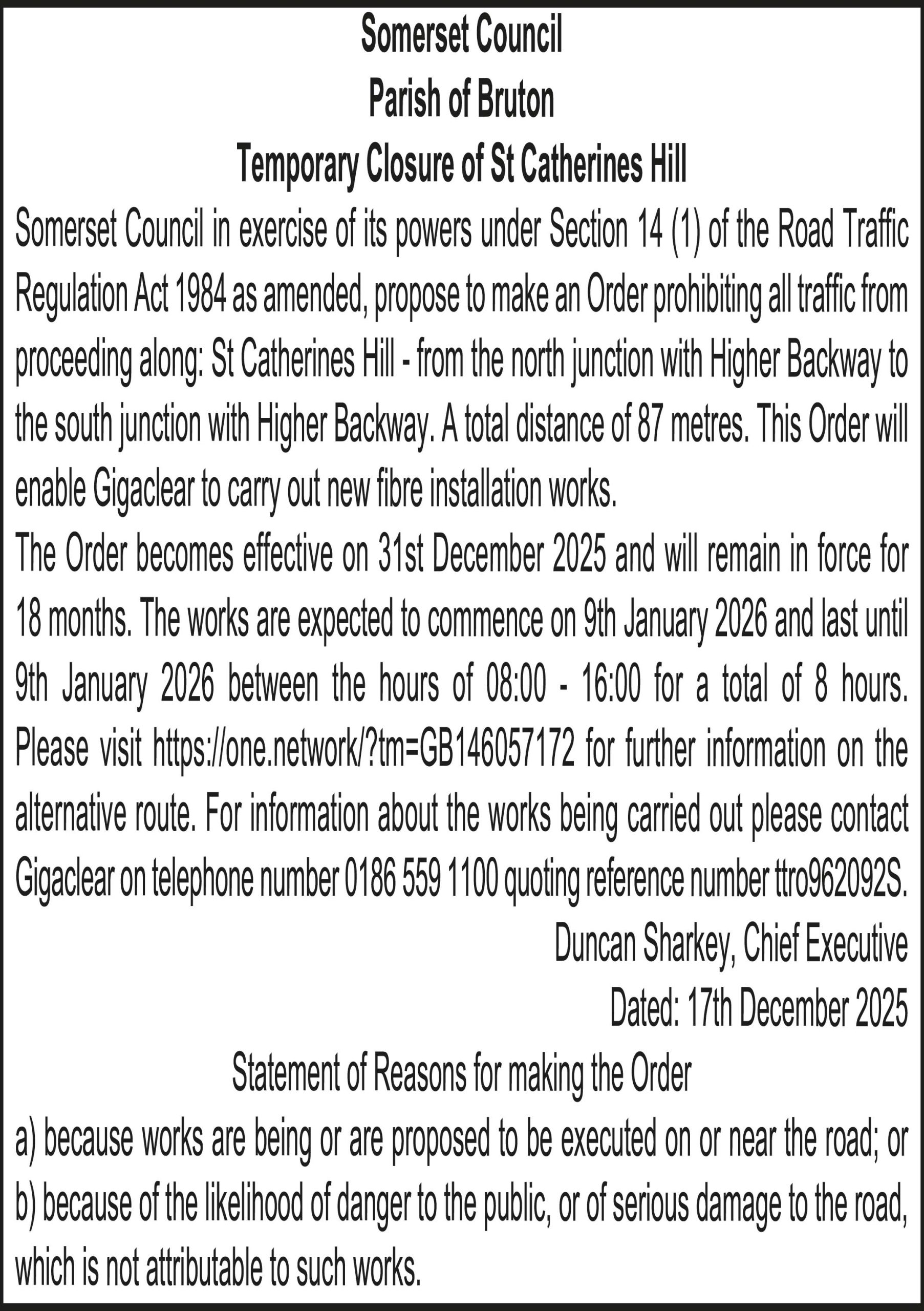 The Order becomes effective on 31st December 2025 and will remain in force for 18 months. The works are expected to commence on 9th January 2026 and last until 9th January 2026 between the hours of 08:00 – 16:00 for a total of 8 hours. Please visit https://one.network/?tm=GB146057172 for further information on the alternative route. For information about the works being carried out please contact Gigaclear on telephone number 0186 559 1100 quoting reference number ttro962092S.