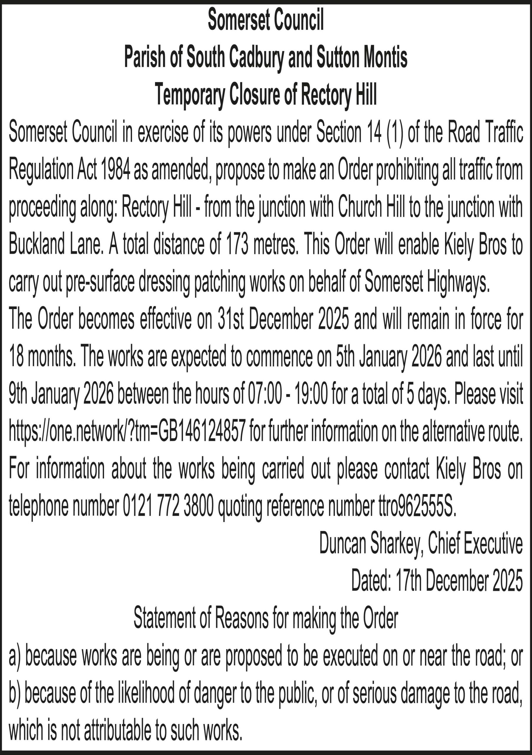 Somerset Council in exercise of its powers under Section 14 (1) of the Road Traffic Regulation Act 1984 as amended, propose to make an Order prohibiting all traffic from proceeding along: Rectory Hill – from the junction with Church Hill to the junction with Buckland Lane. A total distance of 173 metres. This Order will enable Kiely Bros to carry out pre-surface dressing patching works on behalf of Somerset Highways.