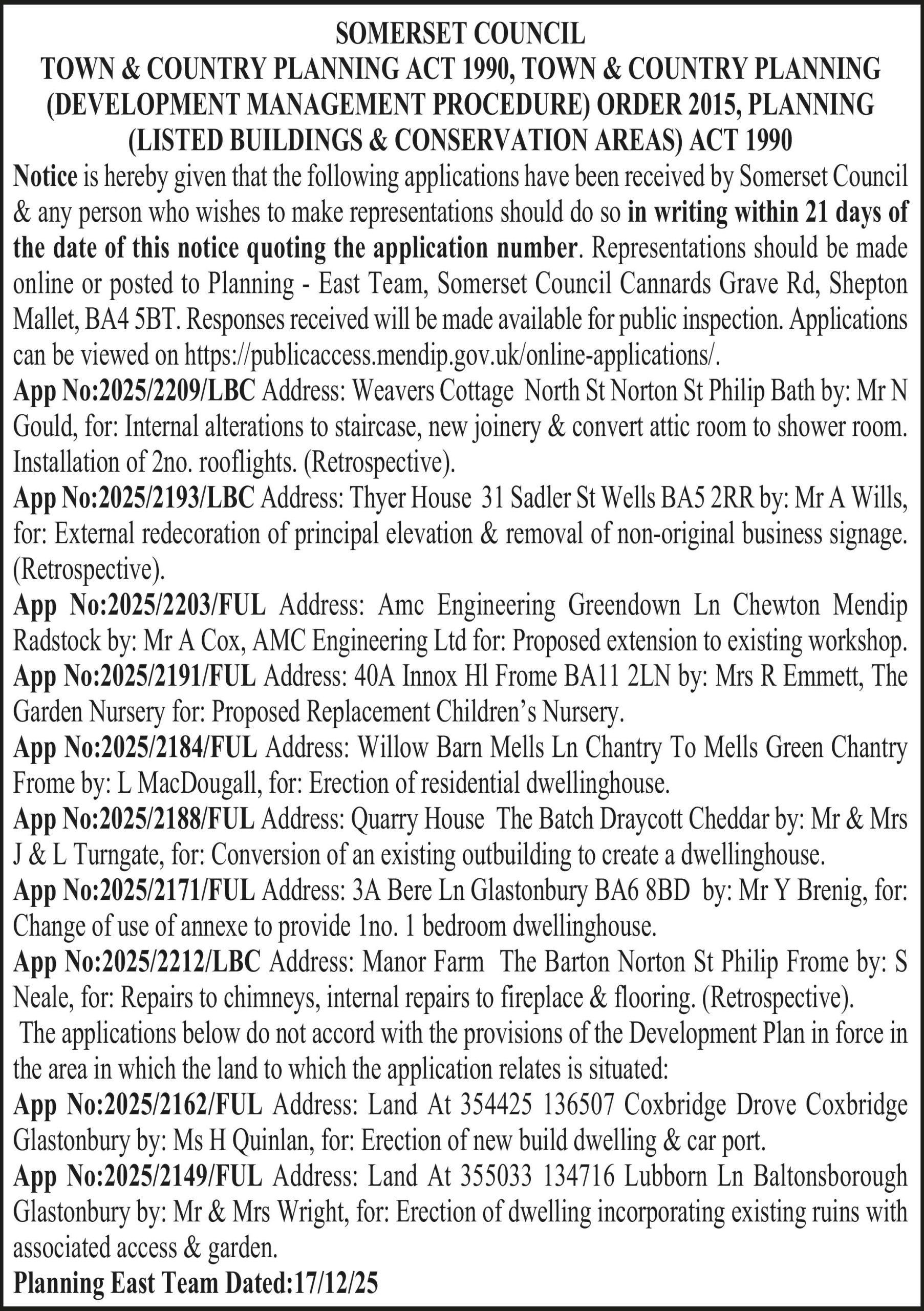 Notice is hereby given that the following applications have been received by Somerset Council & any person who wishes to make representations should do so in writing within 21 days of the date of this notice quoting the application number. Representations should be made online or posted to Planning – East Team, Somerset Council Cannards Grave Rd, Shepton Mallet, BA4 5BT. Responses received will be made available for public inspection. Applications can be viewed on https://publicaccess.mendip.gov.uk/online-applications/.
