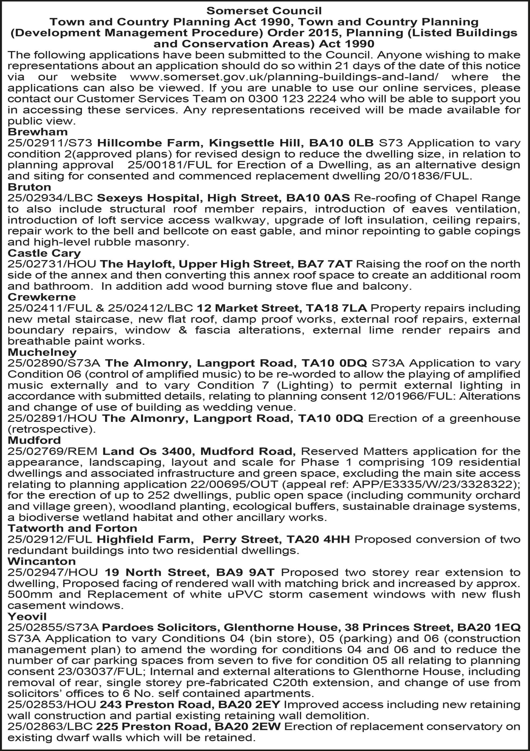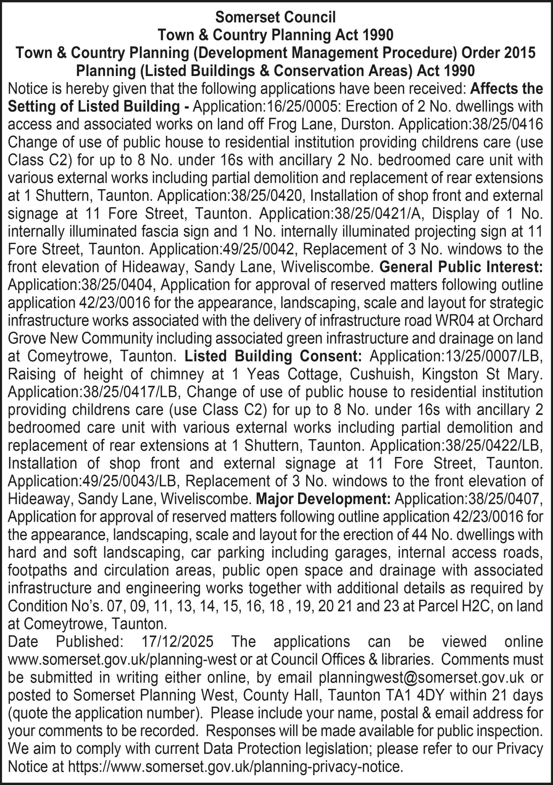 Notice is hereby given that the following applications have been received: Affects the Setting of Listed Building – Application:16/25/0005: Erection of 2 No. dwellings with access and associated works on land off Frog Lane, Durston. Application:38/25/0416 Change of use of public house to residential institution providing childrens care (use Class C2) for up to 8 No. under 16s with ancillary 2 No. bedroomed care unit with various external works including partial demolition and replacement of rear extensions at 1 Shuttern, Taunton. Application:38/25/0420, Installation of shop front and external signage at 11 Fore Street, Taunton. Application:38/25/0421/A, Display of 1 No. internally illuminated fascia sign and 1 No. internally illuminated projecting sign at 11 Fore Street, Taunton. Application:49/25/0042, Replacement of 3 No. windows to the front elevation of Hideaway, Sandy Lane, Wiveliscombe. General Public Interest: Application:38/25/0404, Application for approval of reserved matters following outline application 42/23/0016 for the appearance, landscaping, scale and layout for strategic infrastructure works associated with the delivery of infrastructure road WR04 at Orchard Grove New Community including associated green infrastructure and drainage on land at Comeytrowe, Taunton. Listed Building Consent: Application:13/25/0007/LB, Raising of height of chimney at 1 Yeas Cottage, Cushuish, Kingston St Mary. Application:38/25/0417/LB, Change of use of public house to residential institution providing childrens care (use Class C2) for up to 8 No. under 16s with ancillary 2 bedroomed care unit with various external works including partial demolition and replacement of rear extensions at 1 Shuttern, Taunton. Application:38/25/0422/LB, Installation of shop front and external signage at 11 Fore Street, Taunton. Application:49/25/0043/LB, Replacement of 3 No. windows to the front elevation of Hideaway, Sandy Lane, Wiveliscombe. Major Development: Application:38/25/0407, Application for approval of reserved matters following outline application 42/23/0016 for the appearance, landscaping, scale and layout for the erection of 44 No. dwellings with hard and soft landscaping, car parking including garages, internal access roads, footpaths and circulation areas, public open space and drainage with associated infrastructure and engineering works together with additional details as required by Condition No’s. 07, 09, 11, 13, 14, 15, 16, 18 , 19, 20 21 and 23 at Parcel H2C, on land at Comeytrowe, Taunton.