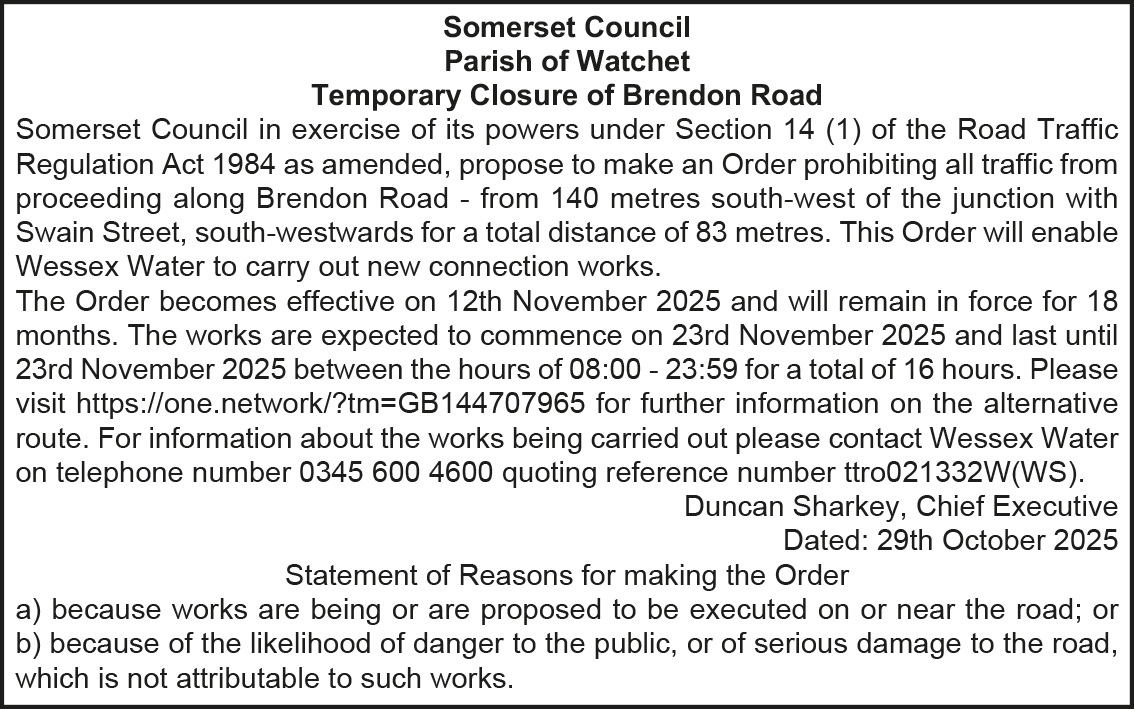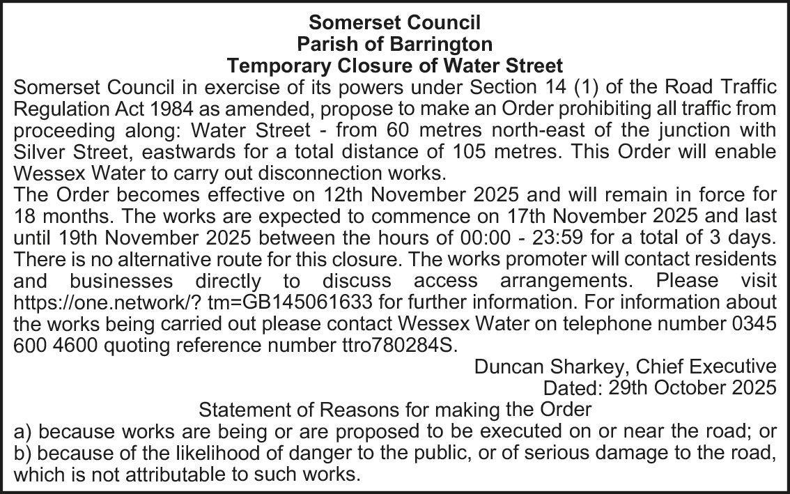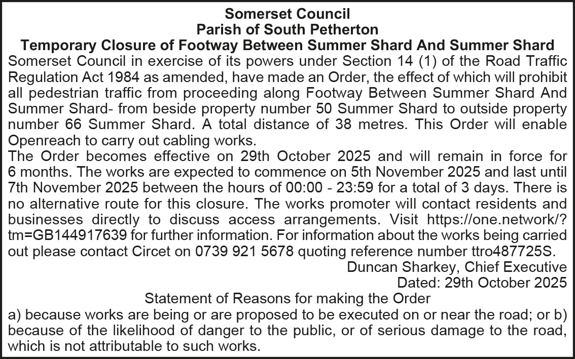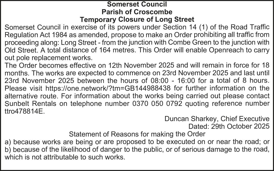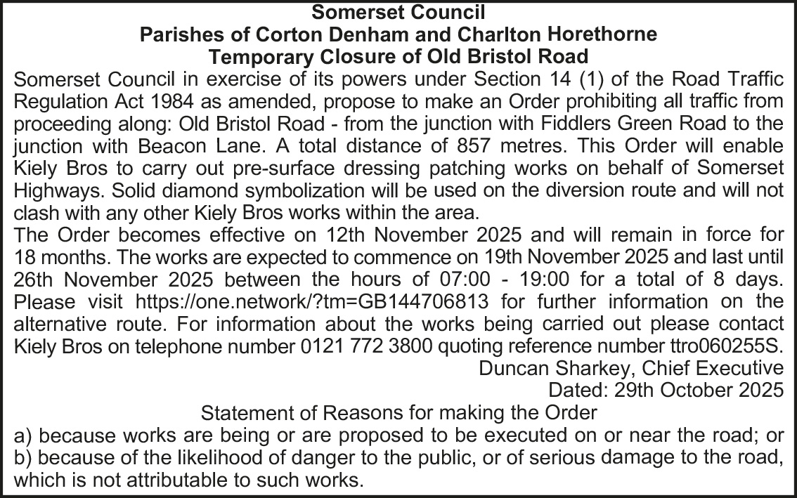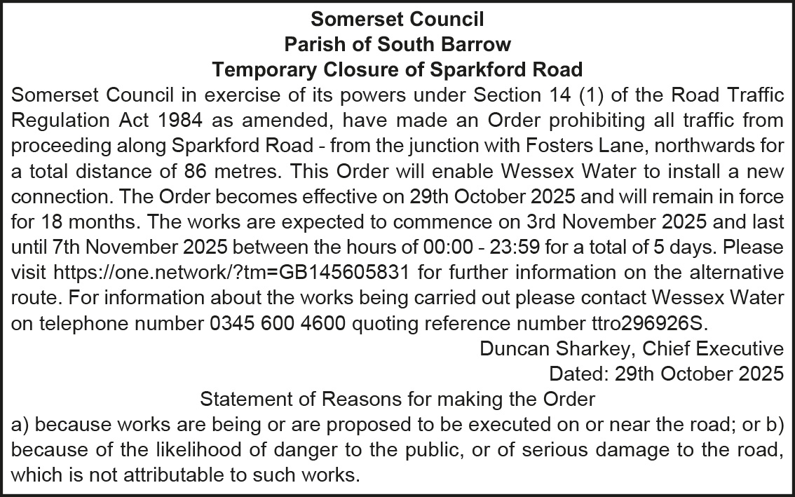 Somerset Council in exercise of its powers under Section 14 (1) of the Road Traffic Regulation Act 1984 as amended, have made an Order prohibiting all traffic from proceeding along Sparkford Road – from the junction with Fosters Lane, northwards for a total distance of 86 metres. This Order will enable Wessex Water to install a new connection. The Order becomes effective on 29th October 2025 and will remain in force for 18 months. The works are expected to commence on 3rd November 2025 and last until 7th November 2025 between the hours of 00:00 – 23:59 for a total of 5 days. Please visit https://one.network/?tm=GB145605831 for further information on the alternative route. For information about the works being carried out please contact Wessex Water on telephone number 0345 600 4600 quoting reference number ttro296926S.
