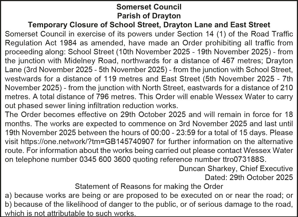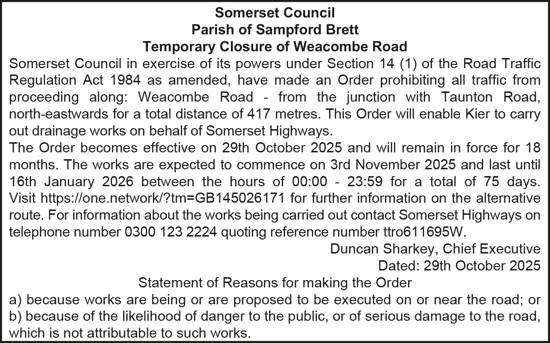 Somerset Council in exercise of its powers under Section 14 (1) of the Road Traffic Regulation Act 1984 as amended, have made an Order prohibiting all traffic from proceeding along: Weacombe Road – from the junction with Taunton Road, north-eastwards for a total distance of 417 metres. This Order will enable Kier to carry out drainage works on behalf of Somerset Highways.
