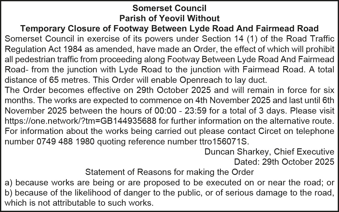 Somerset Council in exercise of its powers under Section 14 (1) of the Road Traffic Regulation Act 1984 as amended, intends to make an Order, the effect of which will be to introduce a temporary prohibition of parking as specified in the Schedule below. This Order will come into operation on the 12th day of November 2025 and will remain in force for 18 months. The works are expected to commence on the 17th day of November 2025 until the 21st day of November 2025 (between 0000 hours and 2359 hours) to enable Kier working on behalf of Somerset Council to carry out works on the footways. The restrictions will only apply when indicated by traffic signs. Exemptions are provided in the Order for emergency vehicles. A copy of the draft Traffic Regulation Order and the associated plans can be examined at www.somerset.gov.uk/TRO. Please visit www.one.network for further information on the alternative route. For information about the works being carried out please contact Somerset Council on 0300 123 2224.