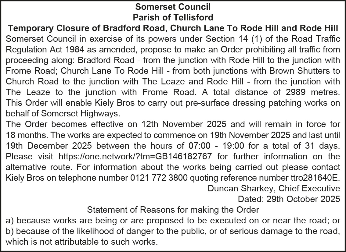 The Order becomes effective on 12th November 2025 and will remain in force for 18 months. The works are expected to commence on 17th November 2025 and last until 27th November 2025 between the hours of 18:30 – 23:30 for a total of 11 evenings. Please visit https://one.network/?tm=GB146213264 for further information on the alternative route. For information about the works being carried out please contact Somerset Highways on telephone number 0300 123 2224 quoting reference number ttro559432W(TD)