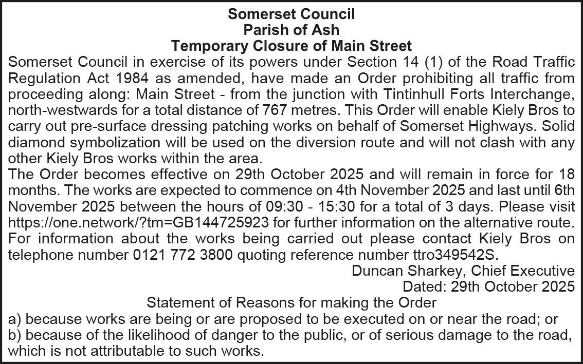 Somerset Council in exercise of its powers under Section 14 (1) of the Road Traffic Regulation Act 1984 as amended, have made an Order prohibiting all traffic from proceeding along: Main Street – from the junction with Tintinhull Forts Interchange, north-westwards for a total distance of 767 metres. This Order will enable Kiely Bros to carry out pre-surface dressing patching works on behalf of Somerset Highways. Solid diamond symbolization will be used on the diversion route and will not clash with any other Kiely Bros works within the area.