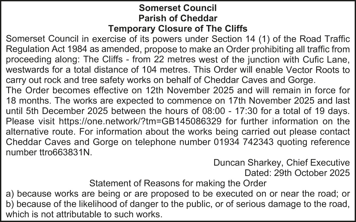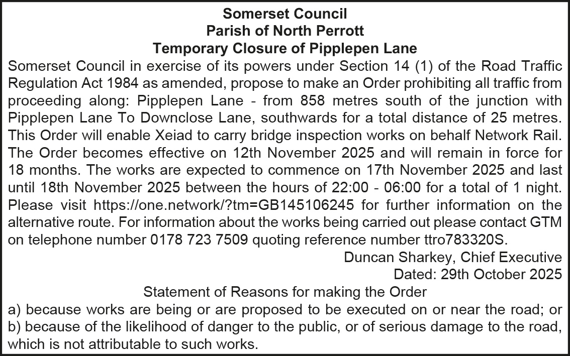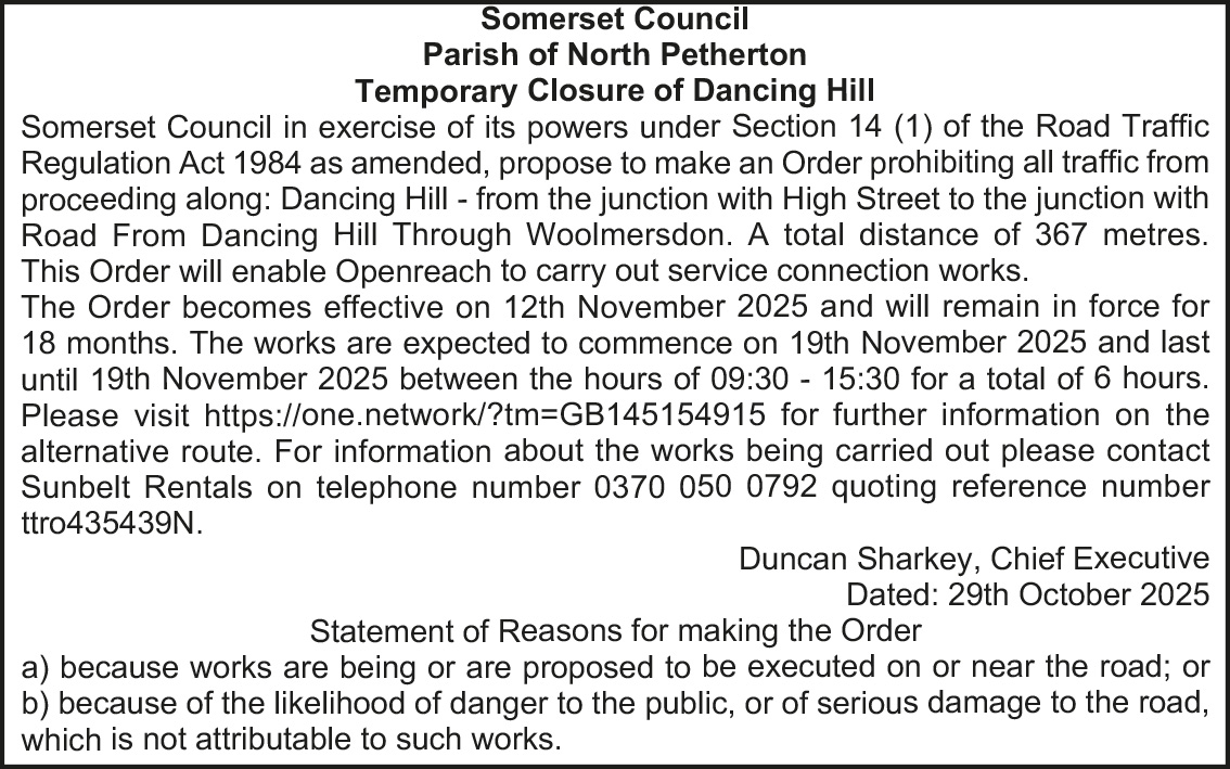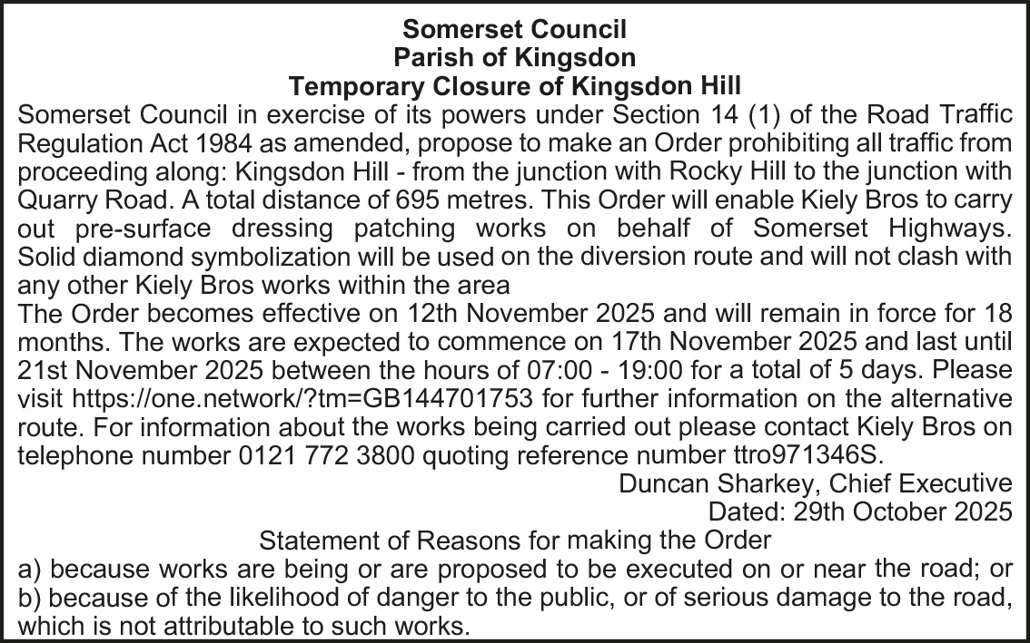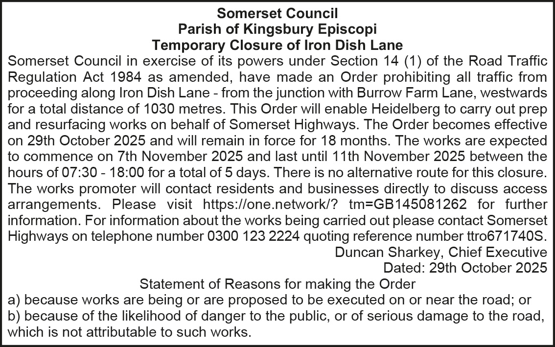 Somerset Council in exercise of its powers under Section 14 (1) of the Road Traffic Regulation Act 1984 as amended, have made an Order prohibiting all traffic from proceeding along Iron Dish Lane – from the junction with Burrow Farm Lane, westwards for a total distance of 1030 metres. This Order will enable Heidelberg to carry out prep and resurfacing works on behalf of Somerset Highways. The Order becomes effective on 29th October 2025 and will remain in force for 18 months. The works are expected to commence on 7th November 2025 and last until 11th November 2025 between the hours of 07:30 – 18:00 for a total of 5 days. There is no alternative route for this closure. The works promoter will contact residents and businesses directly to discuss access arrangements. Please visit https://one.network/? tm=GB145081262 for further information. For information about the works being carried out please contact Somerset Highways on telephone number 0300 123 2224 quoting reference number ttro671740S.