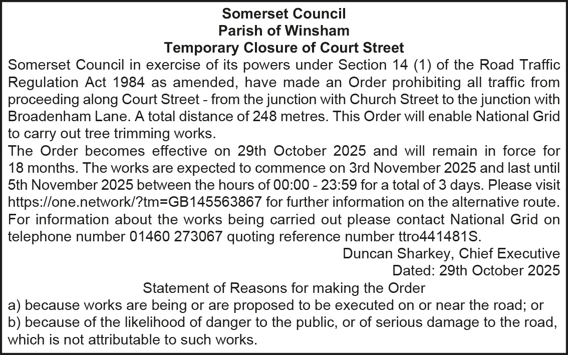 Somerset Council in exercise of its powers under Section 14 (1) of the Road Traffic Regulation Act 1984 as amended, have made an Order prohibiting all traffic from proceeding along Court Street – from the junction with Church Street to the junction with Broadenham Lane. A total distance of 248 metres. This Order will enable National Grid to carry out tree trimming works.