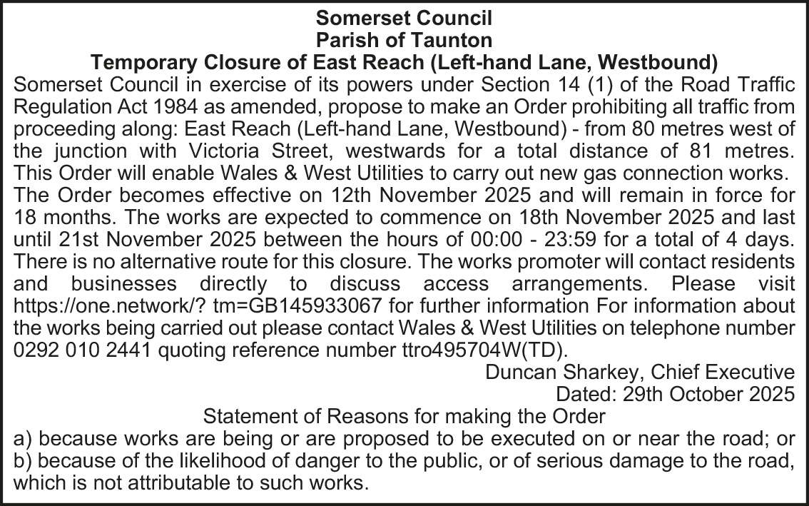 Somerset Council in exercise of its powers under Section 14 (1) of the Road Traffic Regulation Act 1984 as amended, propose to make an Order prohibiting all traffic from proceeding along: East Reach (Left-hand Lane, Westbound) – from 80 metres west of the junction with Victoria Street, westwards for a total distance of 81 metres. This Order will enable Wales & West Utilities to carry out new gas connection works.