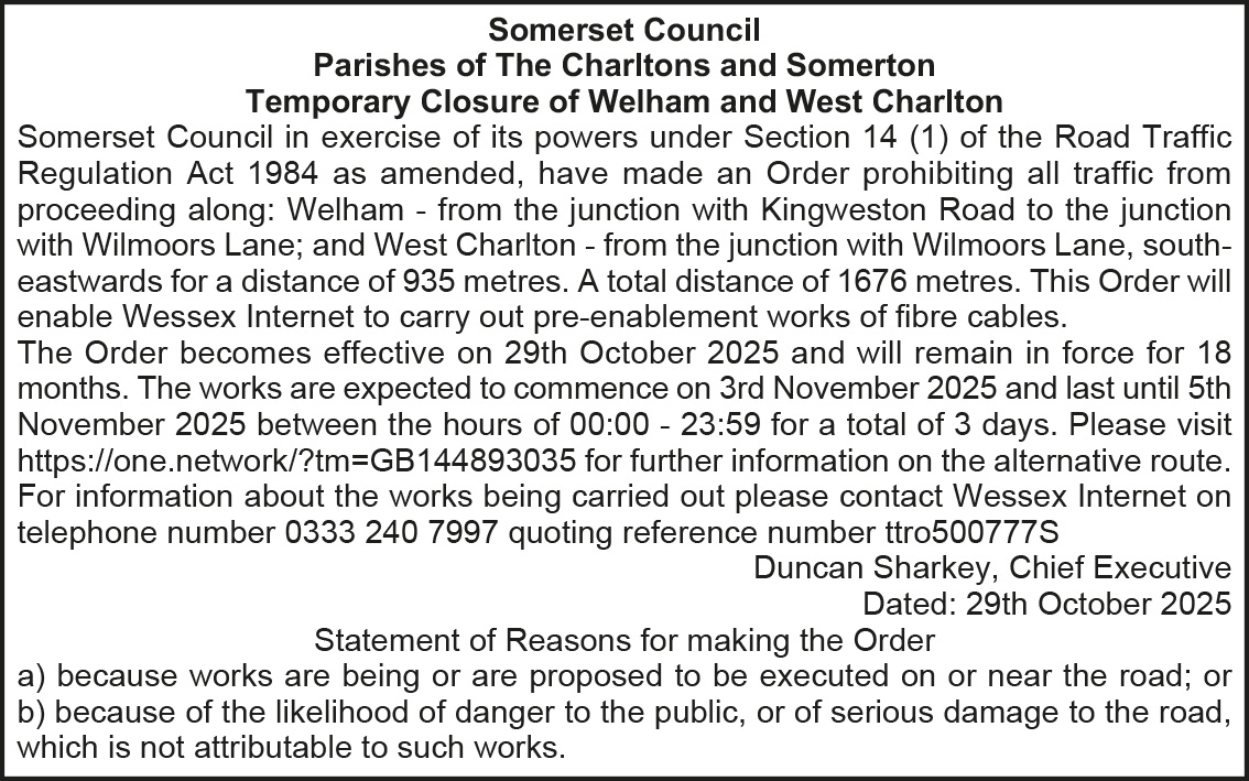 Somerset Council in exercise of its powers under Section 14 (1) of the Road Traffic Regulation Act 1984 as amended, have made an Order prohibiting all traffic from proceeding along: Welham – from the junction with Kingweston Road to the junction with Wilmoors Lane; and West Charlton – from the junction with Wilmoors Lane, southeastwards for a distance of 935 metres. A total distance of 1676 metres. This Order will enable Wessex Internet to carry out pre-enablement works of fibre cables.
