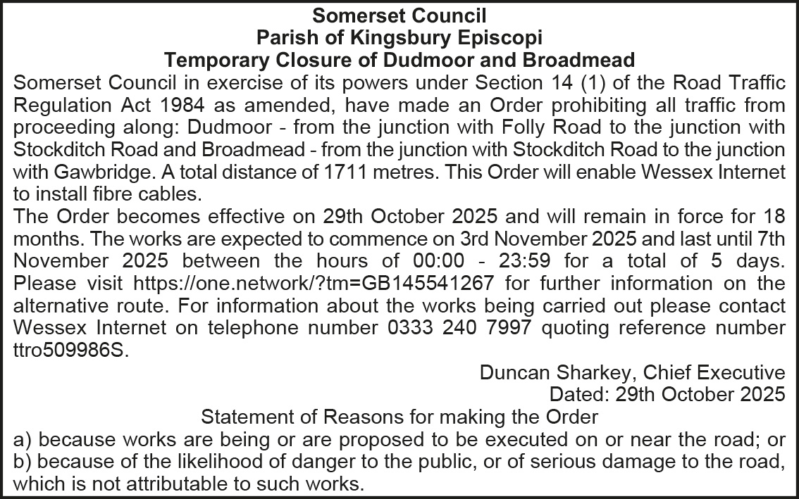 Somerset Council in exercise of its powers under Section 14 (1) of the Road Traffic Regulation Act 1984 as amended, have made an Order prohibiting all traffic from proceeding along: Dudmoor – from the junction with Folly Road to the junction with Stockditch Road and Broadmead – from the junction with Stockditch Road to the junction with Gawbridge. A total distance of 1711 metres. This Order will enable Wessex Internet to install fibre cables.