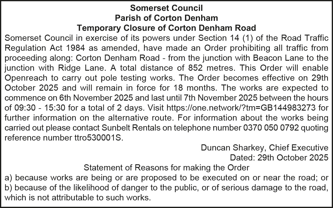 Somerset Council in exercise of its powers under Section 14 (1) of the Road Traffic Regulation Act 1984 as amended, have made an Order prohibiting all traffic from proceeding along: Corton Denham Road – from the junction with Beacon Lane to the junction with Ridge Lane. A total distance of 852 metres. This Order will enable Openreach to carry out pole testing works.