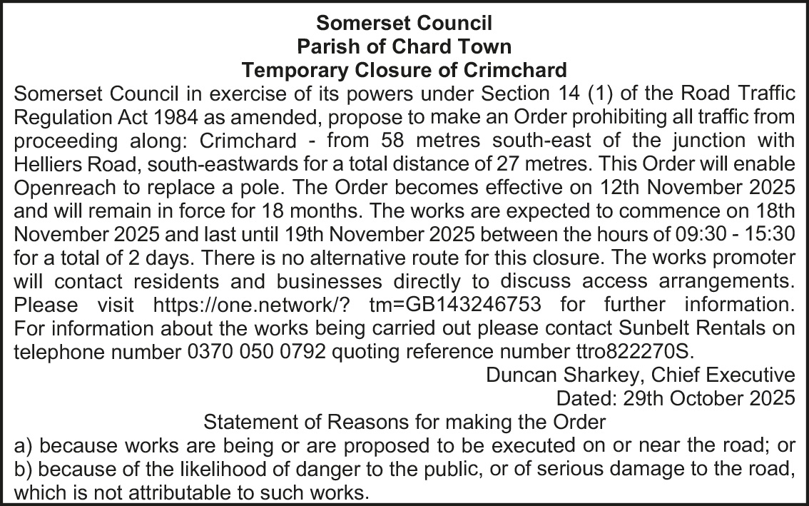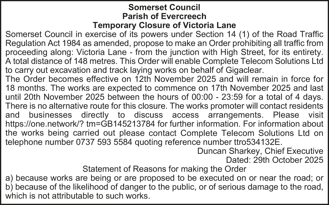 Somerset Council in exercise of its powers under Section 14 (1) of the Road Traffic Regulation Act 1984 as amended, have made an Order prohibiting all traffic from proceeding along Catchgate Lane – from the junction with Crimchard, north-westwards for a total distance of 140 metres. This Order will enable EJC Contracts Ltd to lay duct and build chambers on behalf of Nexifibre.
