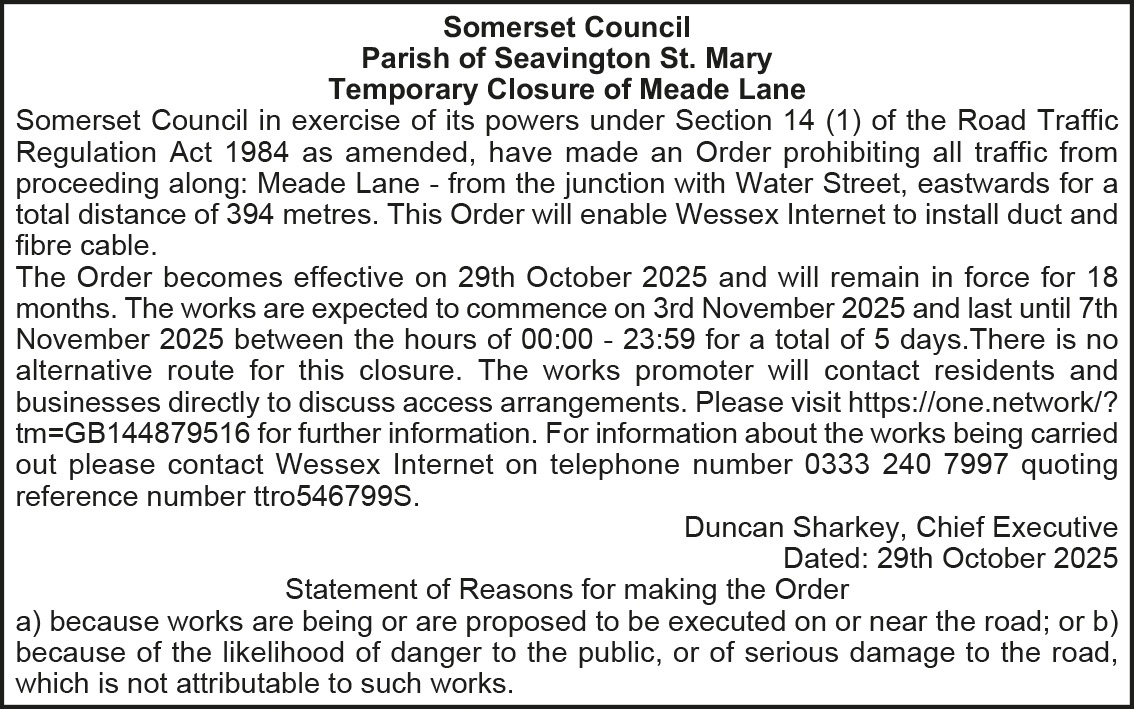 Somerset Council in exercise of its powers under Section 14 (1) of the Road Traffic Regulation Act 1984 as amended, have made an Order prohibiting all traffic from proceeding along: Meade Lane – from the junction with Water Street, eastwards for a total distance of 394 metres. This Order will enable Wessex Internet to install duct and fibre cable.