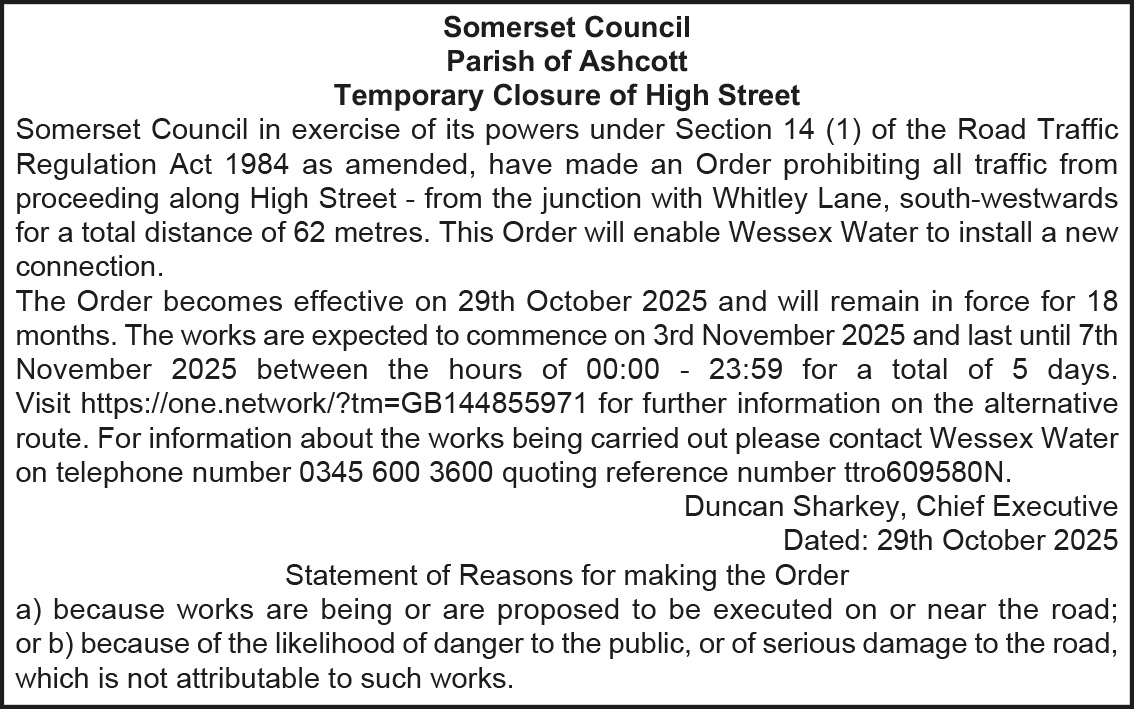 Somerset Council in exercise of its powers under Section 14 (1) of the Road Traffic Regulation Act 1984 as amended, have made an Order prohibiting all traffic from proceeding along High Street – from the junction with Whitley Lane, south-westwards for a total distance of 62 metres. This Order will enable Wessex Water to install a new connection.