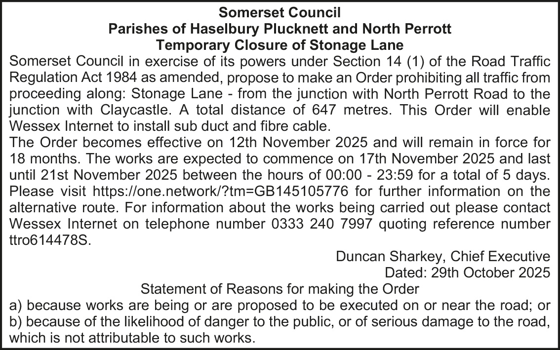 Somerset Council in exercise of its powers under Section 14 (1) of the Road Traffic Regulation Act 1984 as amended, propose to make an Order prohibiting all traffic from proceeding along: Stonage Lane – from the junction with North Perrott Road to the junction with Claycastle. A total distance of 647 metres. This Order will enable Wessex Internet to install sub duct and fibre cable.