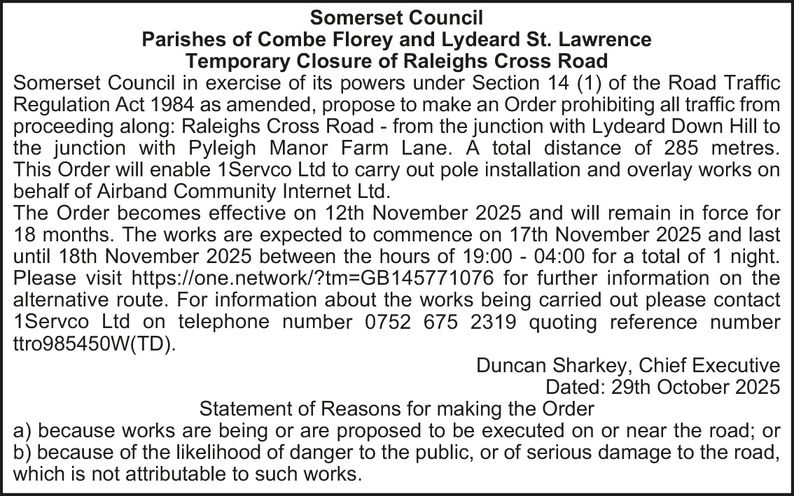 Somerset Council in exercise of its powers under Section 14 (1) of the Road Traffic Regulation Act 1984 as amended, propose to make an Order prohibiting all traffic from proceeding along: Raleighs Cross Road – from the junction with Lydeard Down Hill to the junction with Pyleigh Manor Farm Lane. A total distance of 285 metres. This Order will enable 1Servco Ltd to carry out pole installation and overlay works on behalf of Airband Community Internet Ltd.
