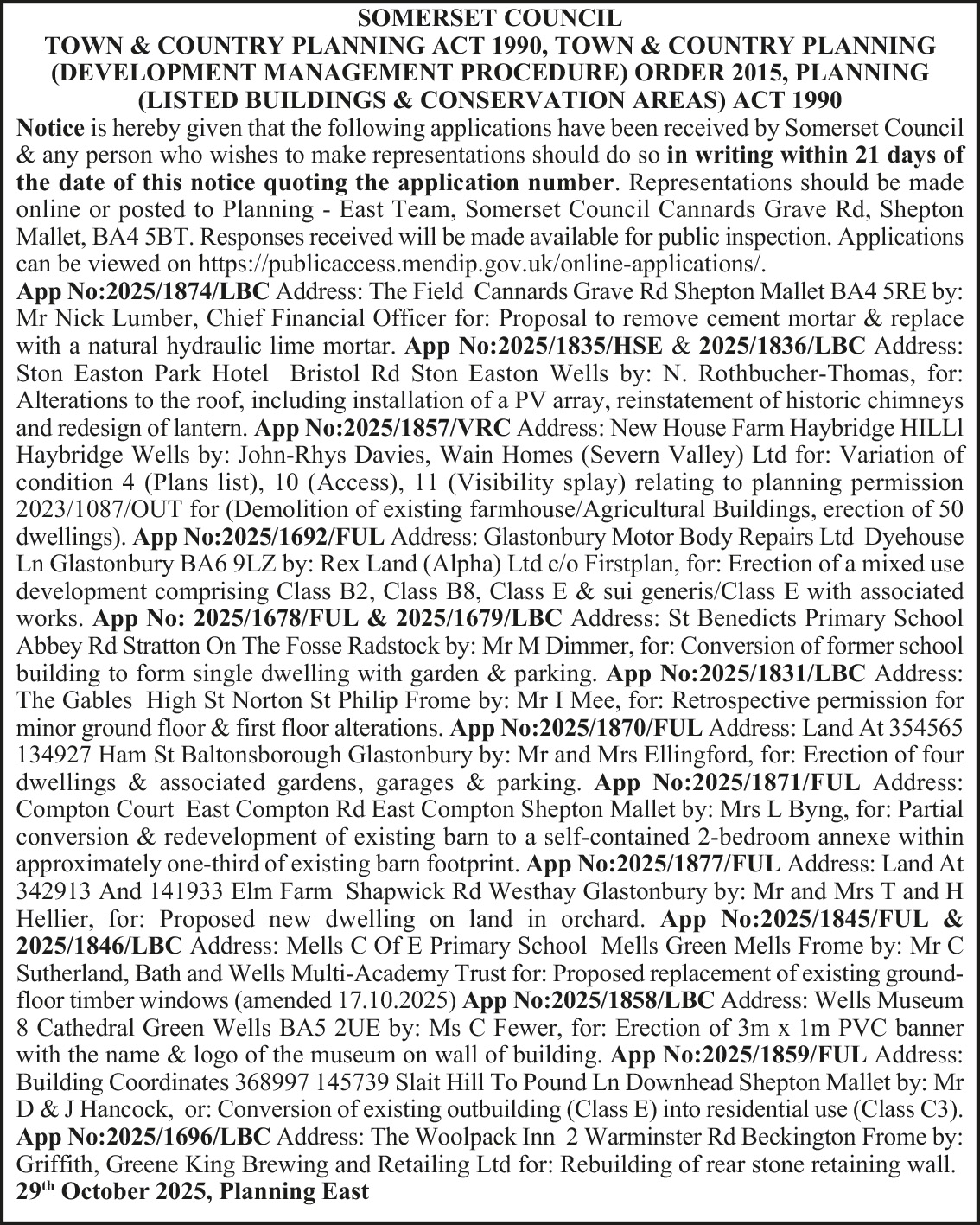 App No:2025/1874/LBC Address: The Field Cannards Grave Rd Shepton Mallet BA4 5RE by: Mr Nick Lumber, Chief Financial Officer for: Proposal to remove cement mortar & replace with a natural hydraulic lime mortar. App No:2025/1835/HSE & 2025/1836/LBC Address: Ston Easton Park Hotel Bristol Rd Ston Easton Wells by: N. Rothbucher-Thomas, for: Alterations to the roof, including installation of a PV array, reinstatement of historic chimneys and redesign of lantern. App No:2025/1857/VRC Address: New House Farm Haybridge HILLl Haybridge Wells by: John-Rhys Davies, Wain Homes (Severn Valley) Ltd for: Variation of condition 4 (Plans list), 10 (Access), 11 (Visibility splay) relating to planning permission 2023/1087/OUT for (Demolition of existing farmhouse/Agricultural Buildings, erection of 50 dwellings). App No:2025/1692/FUL Address: Glastonbury Motor Body Repairs Ltd Dyehouse Ln Glastonbury BA6 9LZ by: Rex Land (Alpha) Ltd c/o Firstplan, for: Erection of a mixed use development comprising Class B2, Class B8, Class E & sui generis/Class E with associated works. App No: 2025/1678/FUL & 2025/1679/LBC Address: St Benedicts Primary School Abbey Rd Stratton On The Fosse Radstock by: Mr M Dimmer, for: Conversion of former school building to form single dwelling with garden & parking. App No:2025/1831/LBC Address: The Gables High St Norton St Philip Frome by: Mr I Mee, for: Retrospective permission for minor ground floor & first floor alterations. App No:2025/1870/FUL Address: Land At 354565 134927 Ham St Baltonsborough Glastonbury by: Mr and Mrs Ellingford, for: Erection of four dwellings & associated gardens, garages & parking. App No:2025/1871/FUL Address: Compton Court East Compton Rd East Compton Shepton Mallet by: Mrs L Byng, for: Partial conversion & redevelopment of existing barn to a self-contained 2-bedroom annexe within approximately one-third of existing barn footprint. App No:2025/1877/FUL Address: Land At 342913 And 141933 Elm Farm Shapwick Rd Westhay Glastonbury by: Mr and Mrs T and H Hellier, for: Proposed new dwelling on land in orchard. App No:2025/1845/FUL & 2025/1846/LBC Address: Mells C Of E Primary School Mells Green Mells Frome by: Mr C Sutherland, Bath and Wells Multi-Academy Trust for: Proposed replacement of existing ground-floor timber windows (amended 17.10.2025) App No:2025/1858/LBC Address: Wells Museum 8 Cathedral Green Wells BA5 2UE by: Ms C Fewer, for: Erection of 3m x 1m PVC banner with the name & logo of the museum on wall of building. App No:2025/1859/FUL Address: Building Coordinates 368997 145739 Slait Hill To Pound Ln Downhead Shepton Mallet by: Mr D & J Hancock, or: Conversion of existing outbuilding (Class E) into residential use (Class C3). App No:2025/1696/LBC Address: The Woolpack Inn 2 Warminster Rd Beckington Frome by: Griffith, Greene King Brewing and Retailing Ltd for: Rebuilding of rear stone retaining wall.