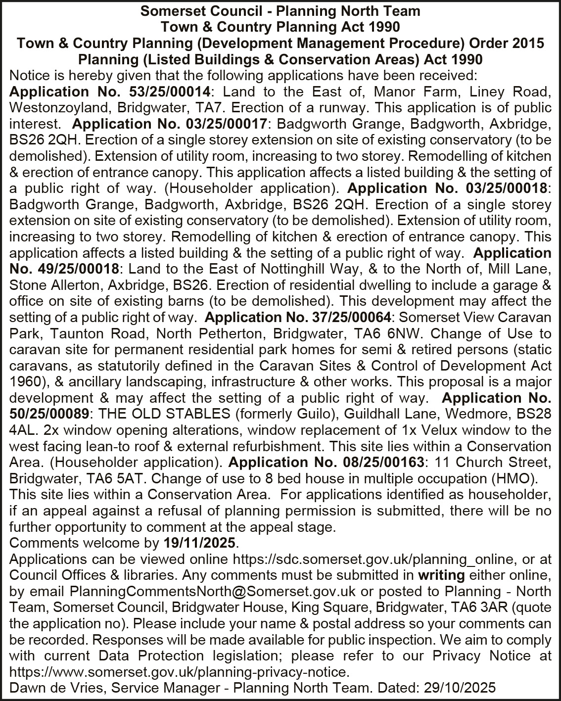 Application No. 53/25/00014: Land to the East of, Manor Farm, Liney Road, Westonzoyland, Bridgwater, TA7. Erection of a runway. This application is of public interest. Application No. 03/25/00017: Badgworth Grange, Badgworth, Axbridge, BS26 2QH. Erection of a single storey extension on site of existing conservatory (to be demolished). Extension of utility room, increasing to two storey. Remodelling of kitchen & erection of entrance canopy. This application affects a listed building & the setting of a public right of way. (Householder application). Application No. 03/25/00018: Badgworth Grange, Badgworth, Axbridge, BS26 2QH. Erection of a single storey extension on site of existing conservatory (to be demolished). Extension of utility room, increasing to two storey. Remodelling of kitchen & erection of entrance canopy. This application affects a listed building & the setting of a public right of way. Application No. 49/25/00018: Land to the East of Nottinghill Way, & to the North of, Mill Lane, Stone Allerton, Axbridge, BS26. Erection of residential dwelling to include a garage & office on site of existing barns (to be demolished). This development may affect the setting of a public right of way. Application No. 37/25/00064: Somerset View Caravan Park, Taunton Road, North Petherton, Bridgwater, TA6 6NW. Change of Use to caravan site for permanent residential park homes for semi & retired persons (static caravans, as statutorily defined in the Caravan Sites & Control of Development Act 1960), & ancillary landscaping, infrastructure & other works. This proposal is a major development & may affect the setting of a public right of way. Application No. 50/25/00089: THE OLD STABLES (formerly Guilo), Guildhall Lane, Wedmore, BS28 4AL. 2x window opening alterations, window replacement of 1x Velux window to the west facing lean-to roof & external refurbishment. This site lies within a Conservation Area. (Householder application). Application No. 08/25/00163: 11 Church Street, Bridgwater, TA6 5AT. Change of use to 8 bed house in multiple occupation (HMO).