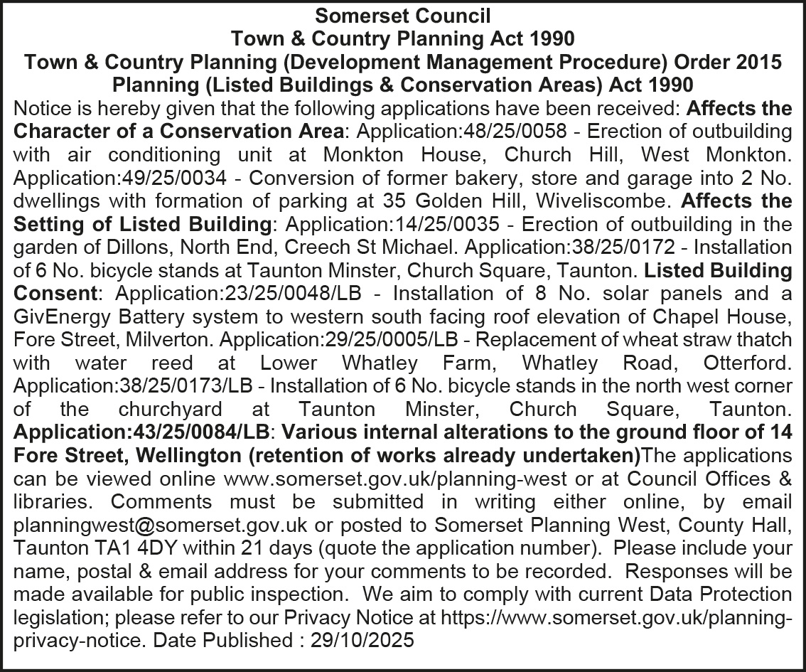 Notice is hereby given that the following applications have been received: Affects the Character of a Conservation Area: Application:48/25/0058 – Erection of outbuilding with air conditioning unit at Monkton House, Church Hill, West Monkton. Application:49/25/0034 – Conversion of former bakery, store and garage into 2 No. dwellings with formation of parking at 35 Golden Hill, Wiveliscombe. Affects the Setting of Listed Building: Application:14/25/0035 – Erection of outbuilding in the garden of Dillons, North End, Creech St Michael. pplication:38/25/0172 – Installation of 6 No. bicycle stands at Taunton Minster, Church Square, Taunton. Listed Building Consent: Application:23/25/0048/LB – Installation of 8 No. solar panels and a GivEnergy Battery system to western south facing roof elevation of Chapel House, Fore Street, Milverton. Application:29/25/0005/LB – Replacement of wheat straw thatch with water reed at Lower Whatley Farm, Whatley Road, Otterford. Application:38/25/0173/LB – Installation of 6 No. bicycle stands in the north west corner of the churchyard at Taunton Minster, Church Square, Taunton. Application:43/25/0084/LB: Various internal alterations to the ground floor of 14 Fore Street, Wellington (retention of works already undertaken)
